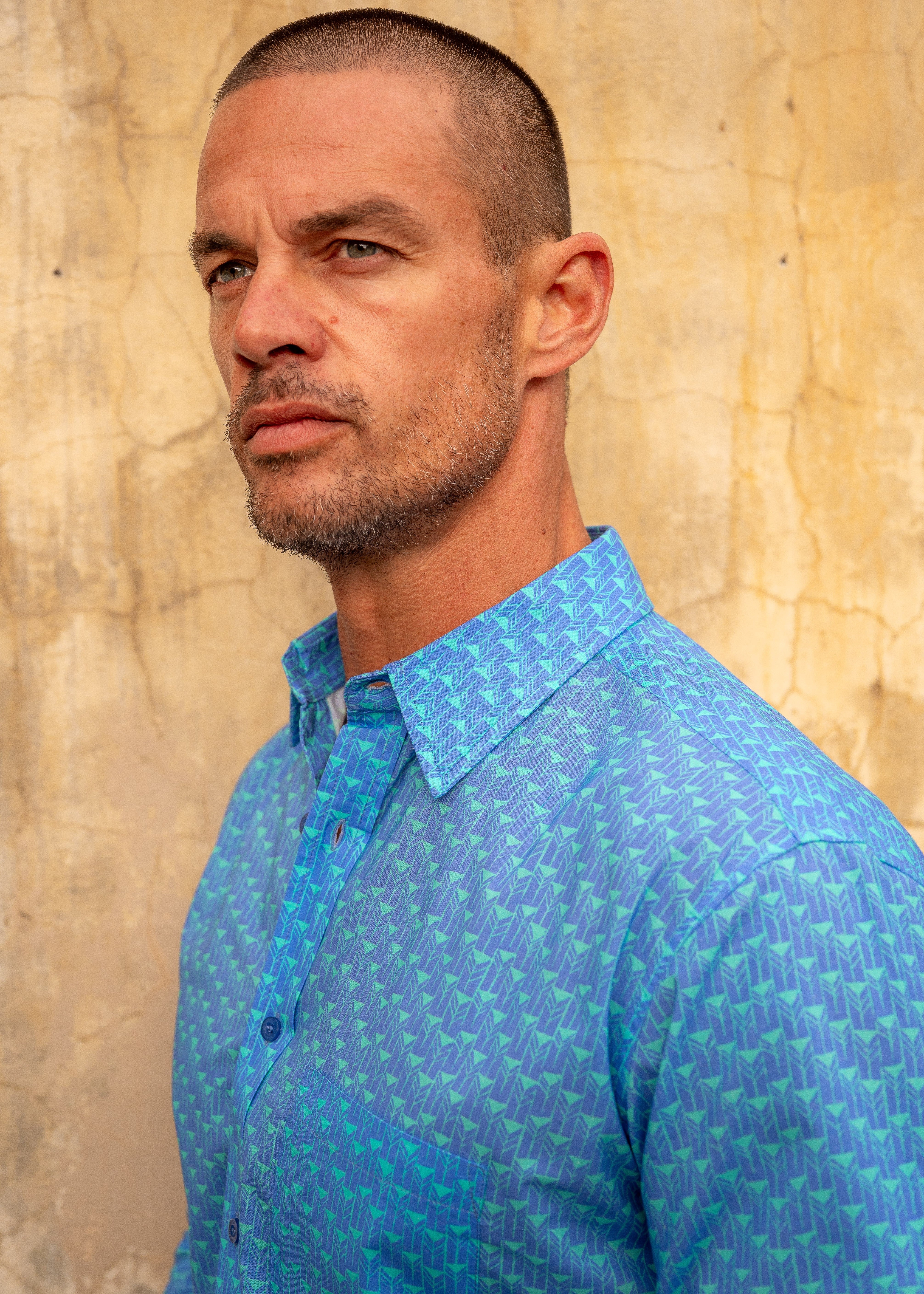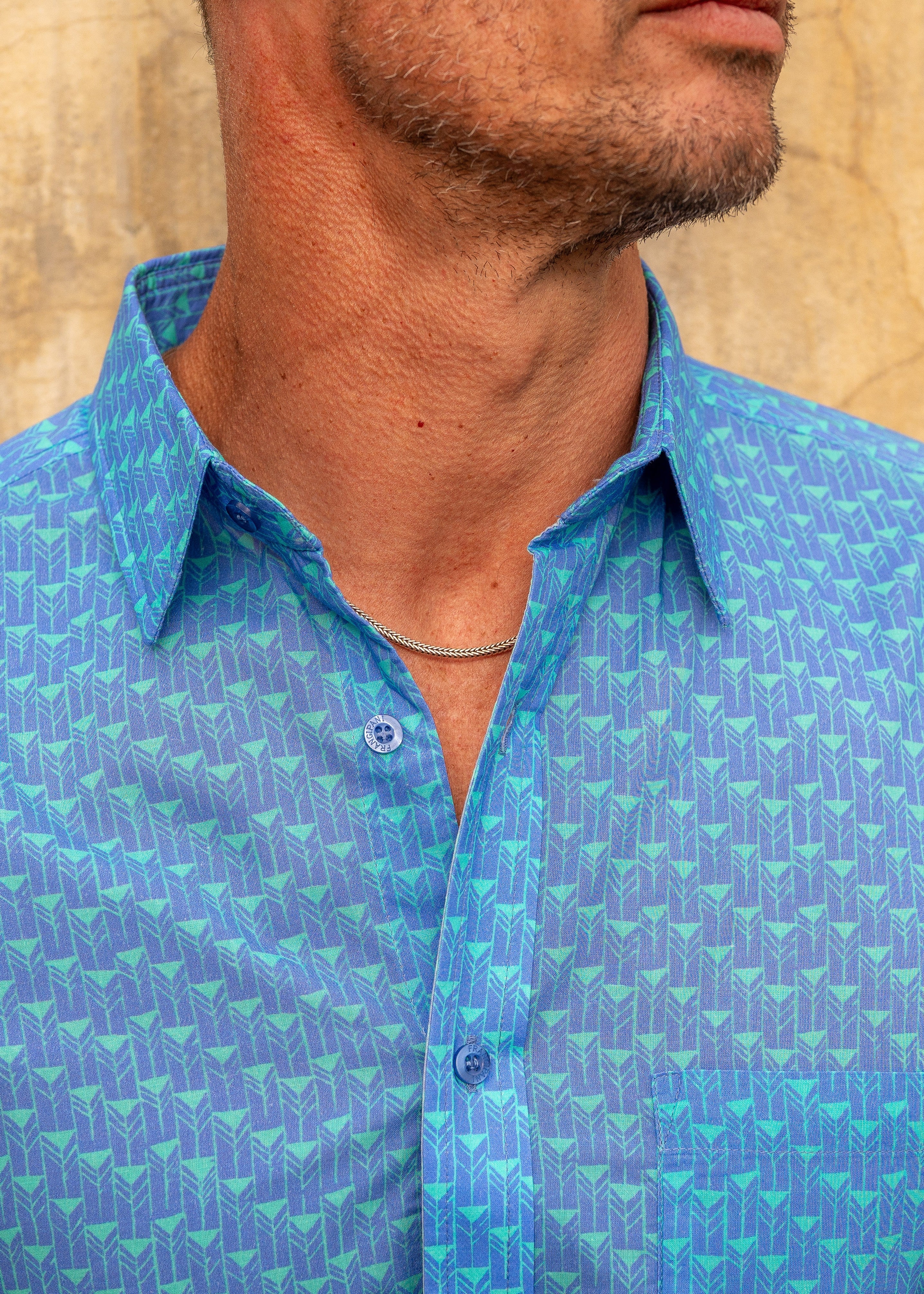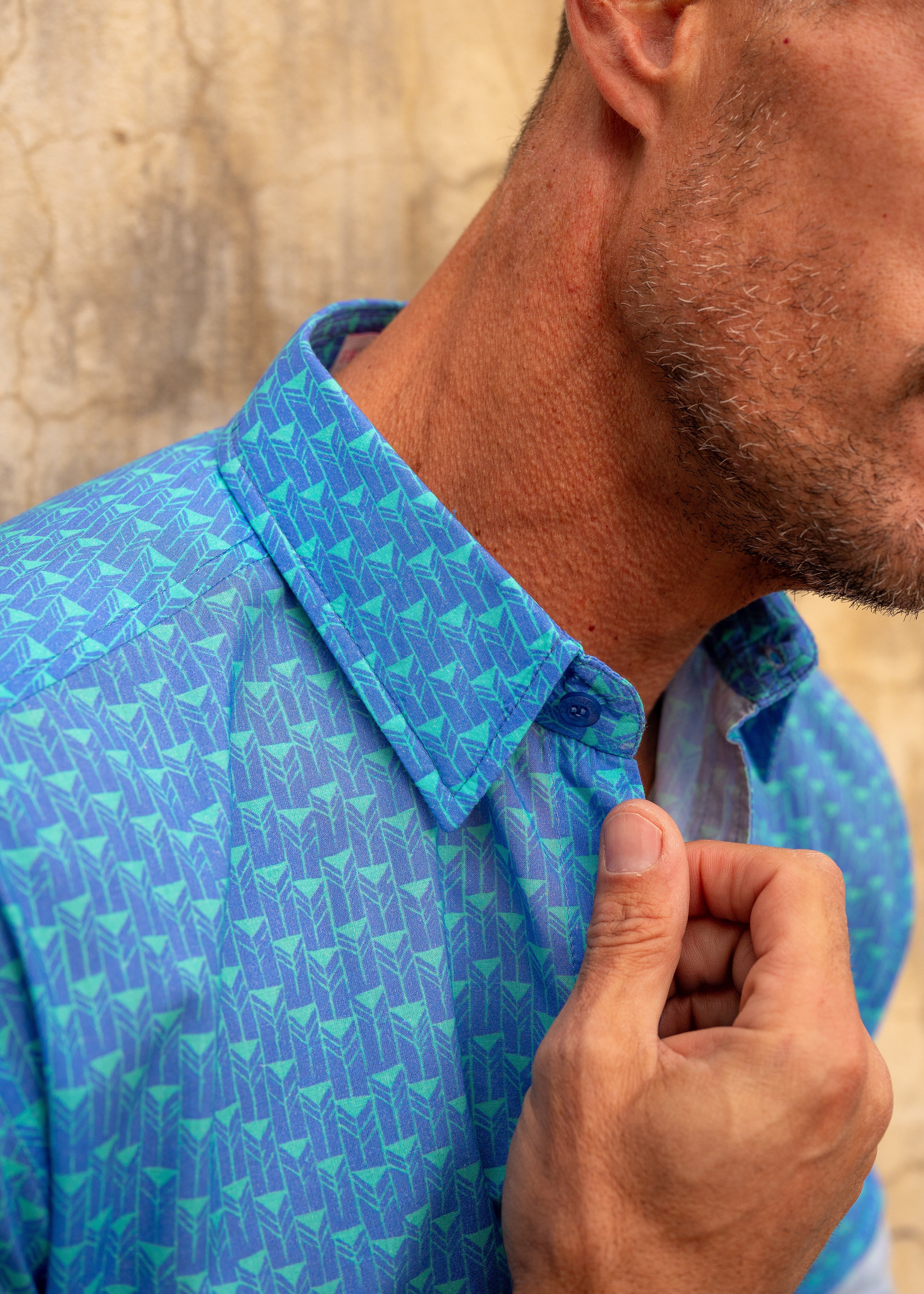 Electro Beats — rhythm in print form. This geometric design pulses with energy, featuring bold turquoise and blue arrows that repeat in perfect sync. Printed in India on smooth organic cotton, it’s a shirt made for movers, makers, and late-night shakers.