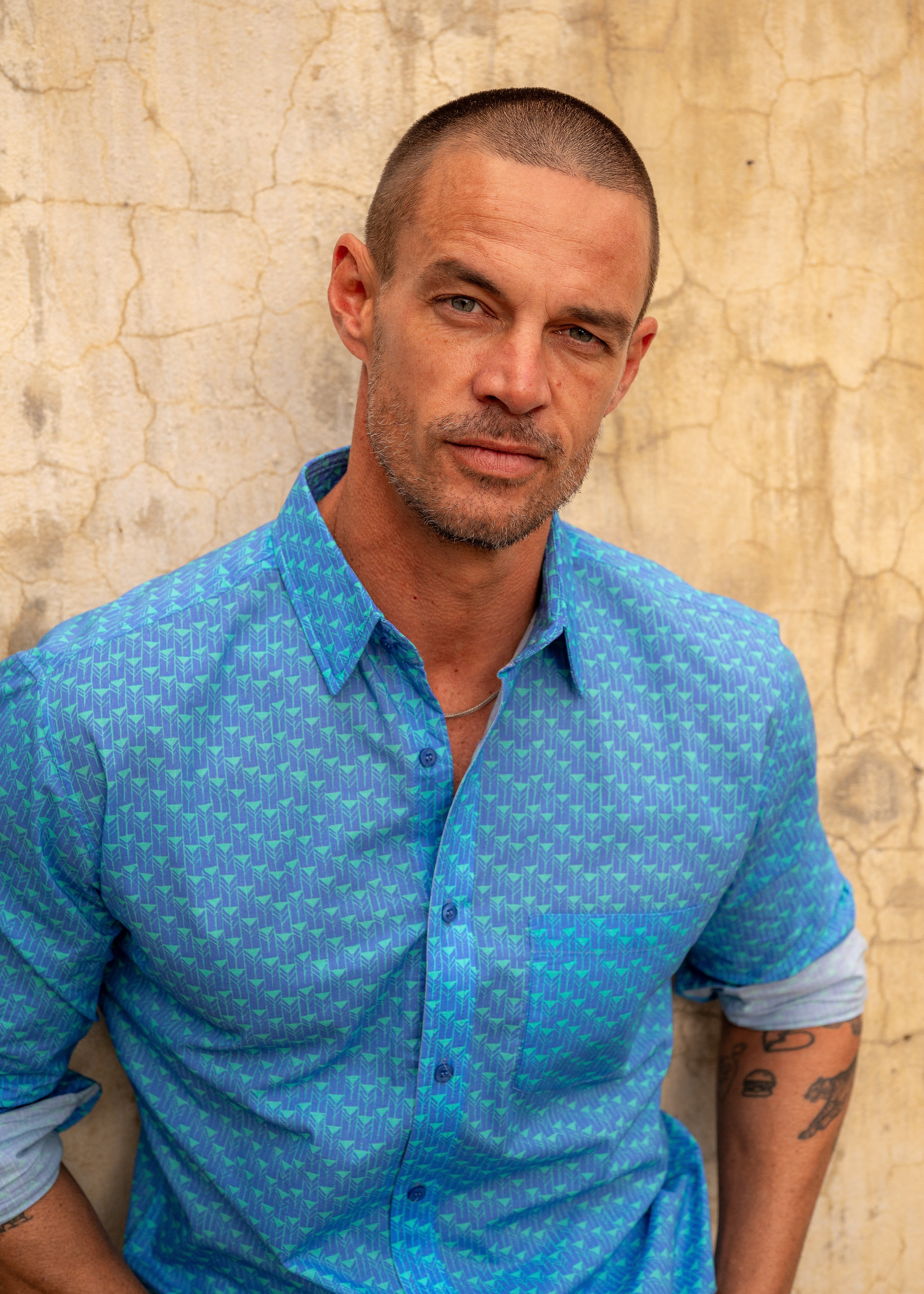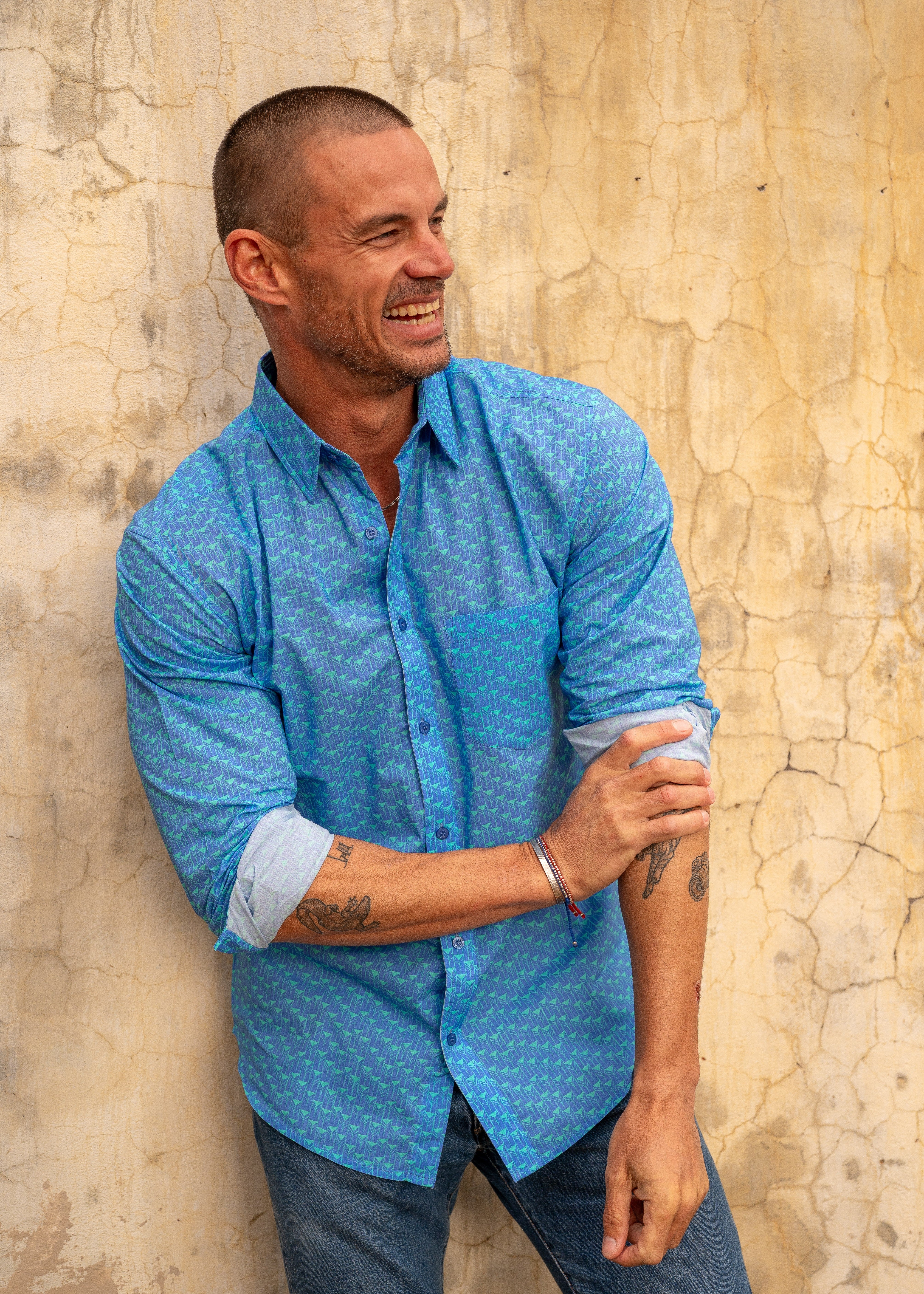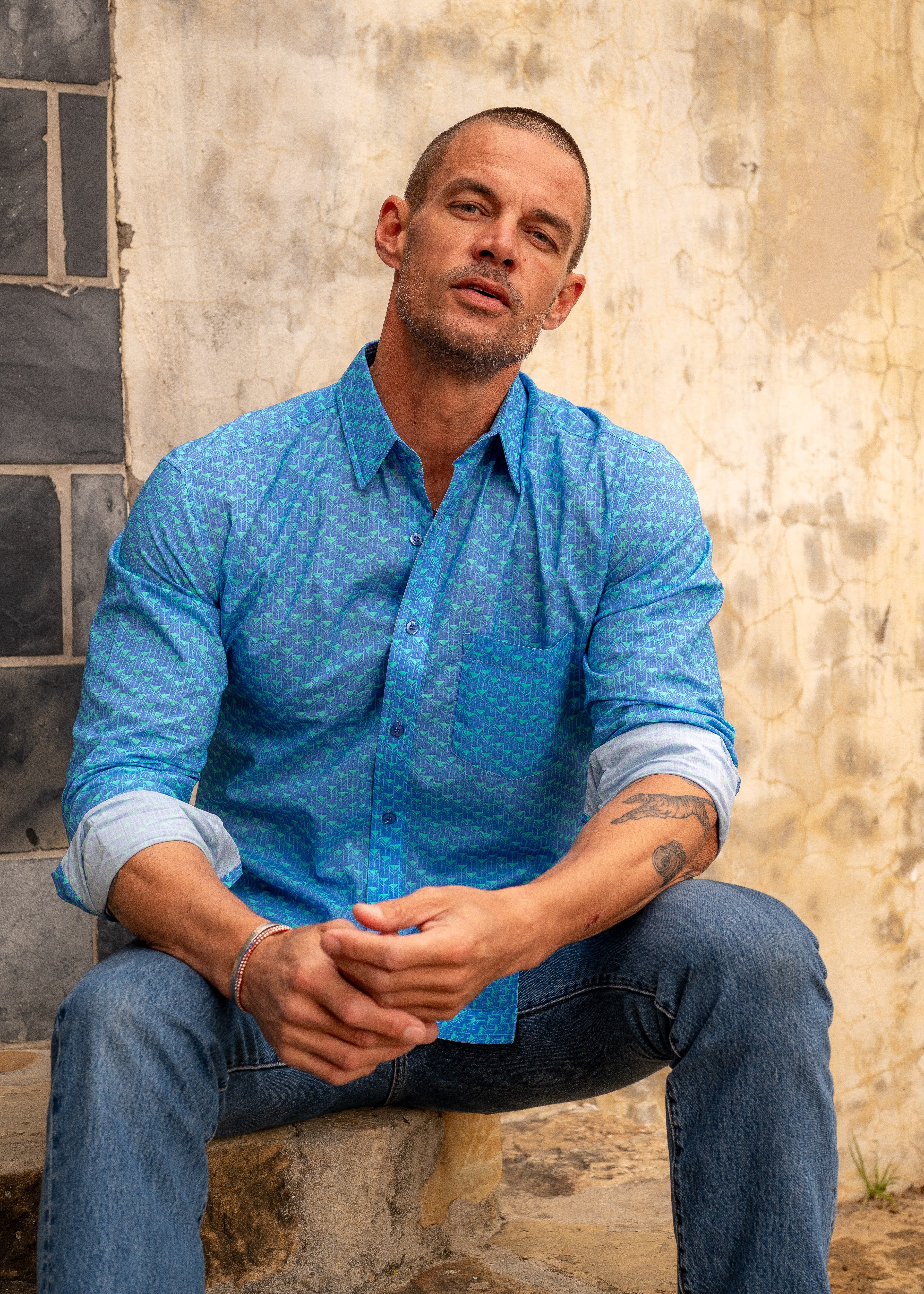 Electro Beats — rhythm in print form. This geometric design pulses with energy, featuring bold turquoise and blue arrows that repeat in perfect sync. Printed in India on smooth organic cotton, it’s a shirt made for movers, makers, and late-night shakers.