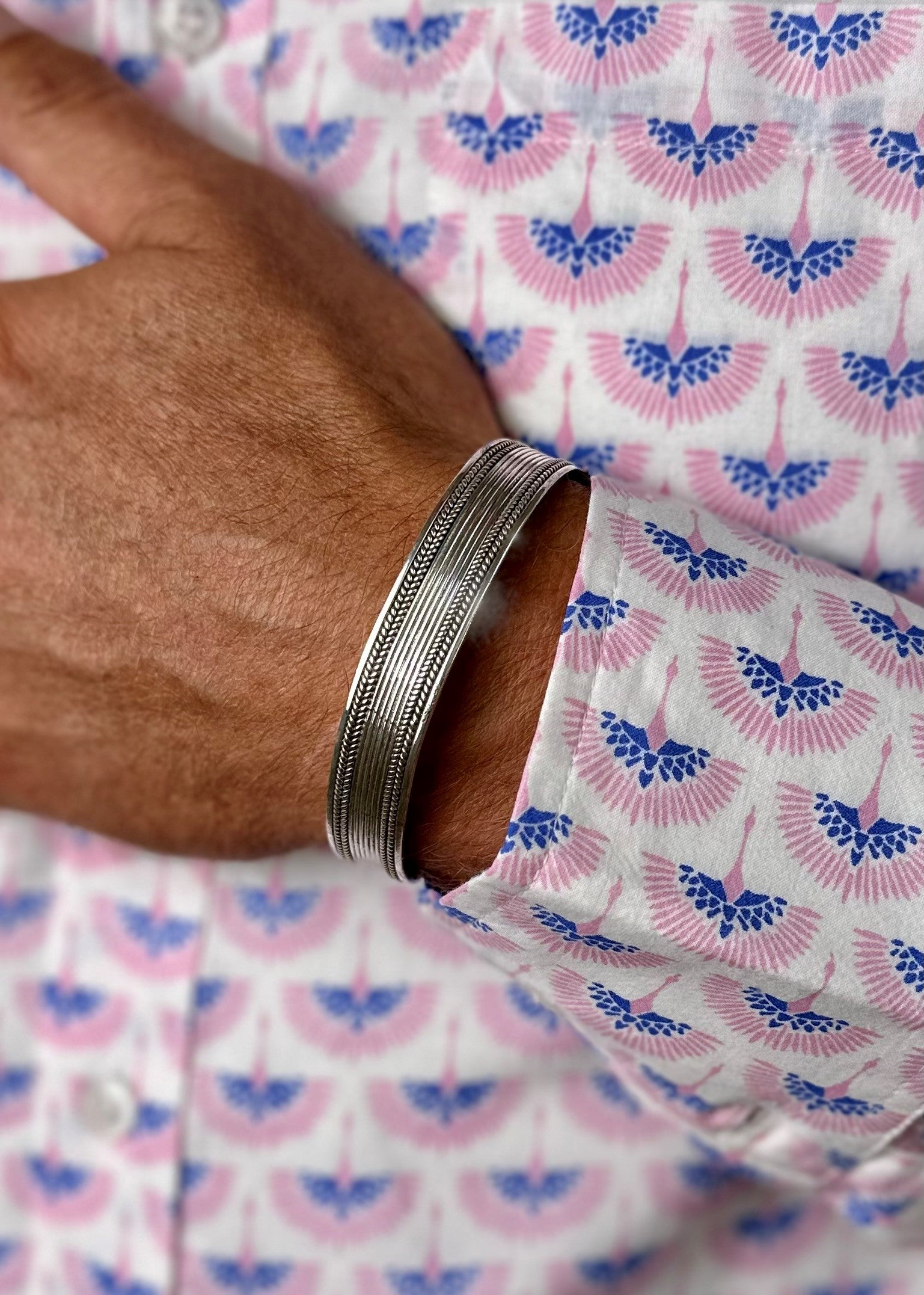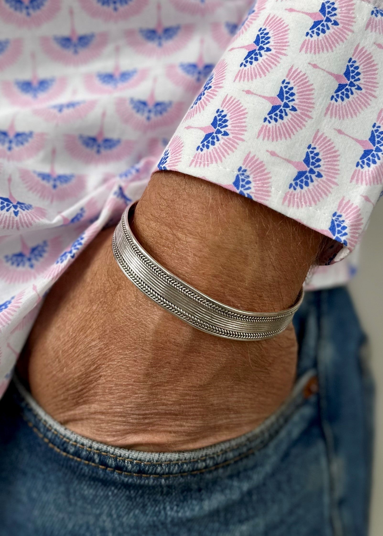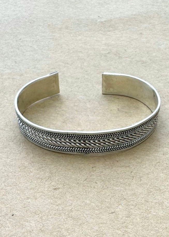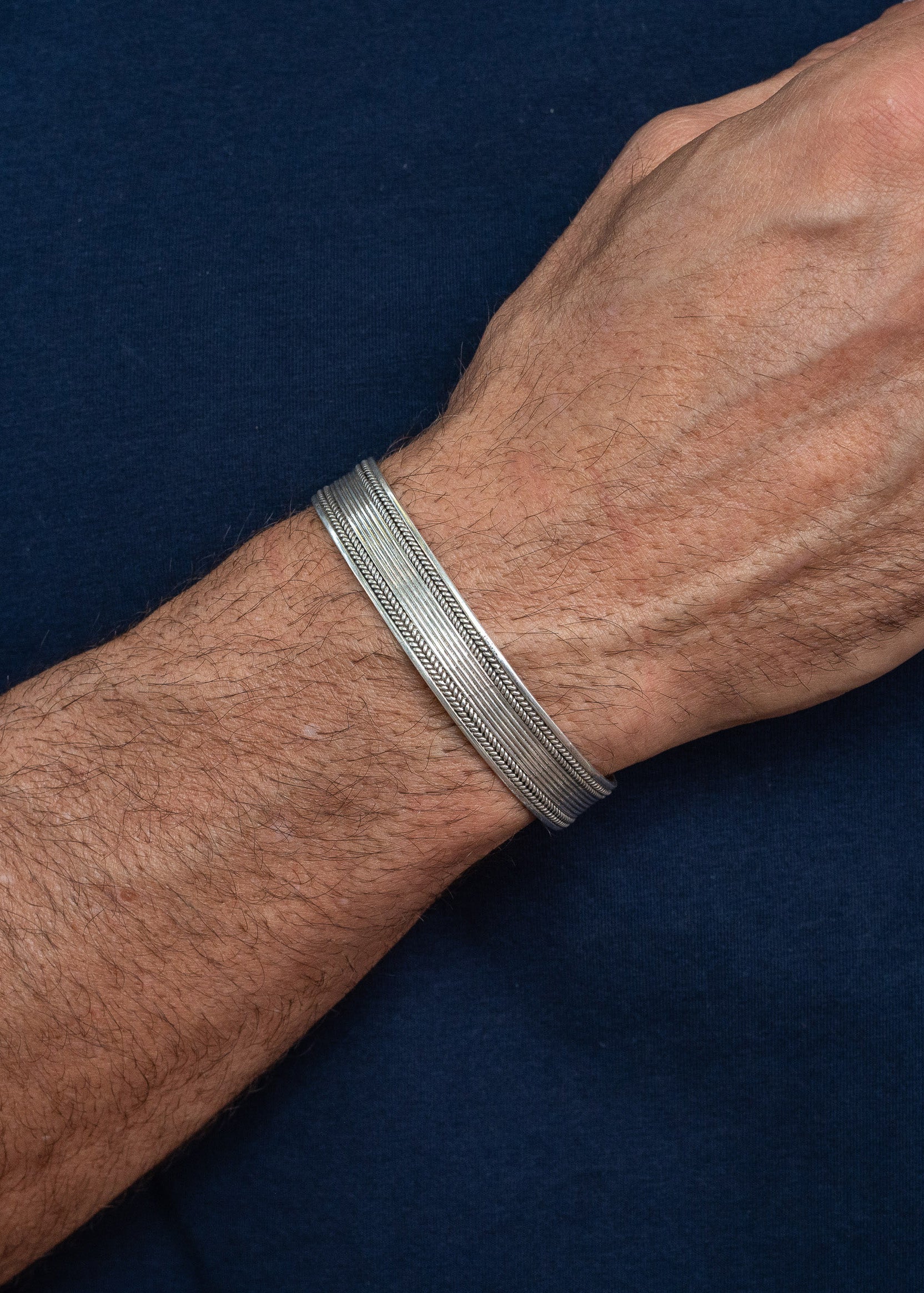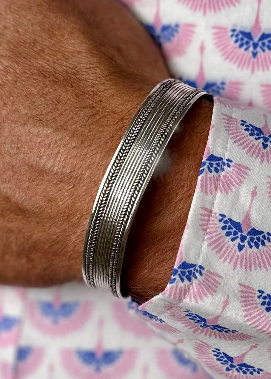 High quality handcrafted sleek silver open cuff with fine line pattern detail