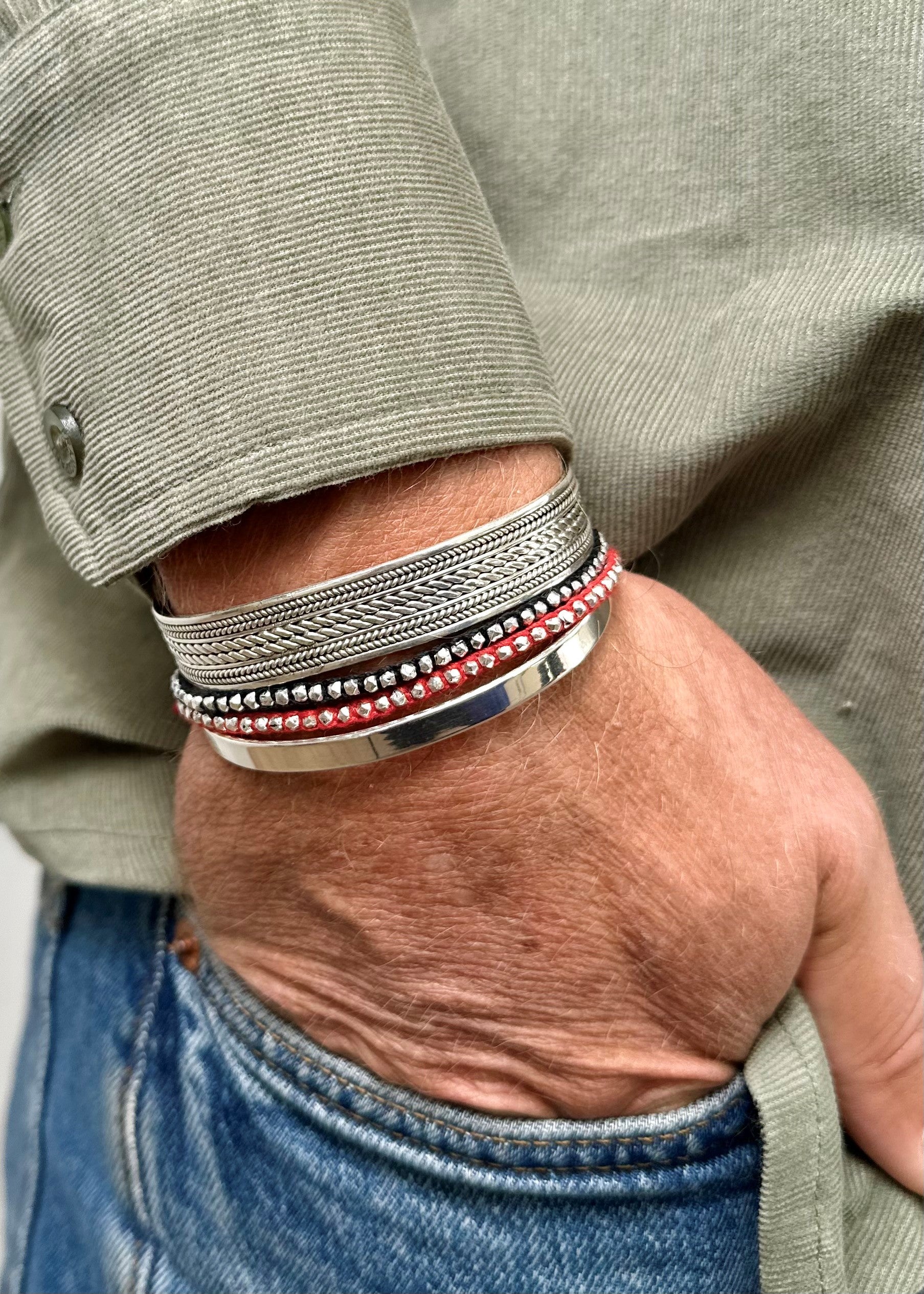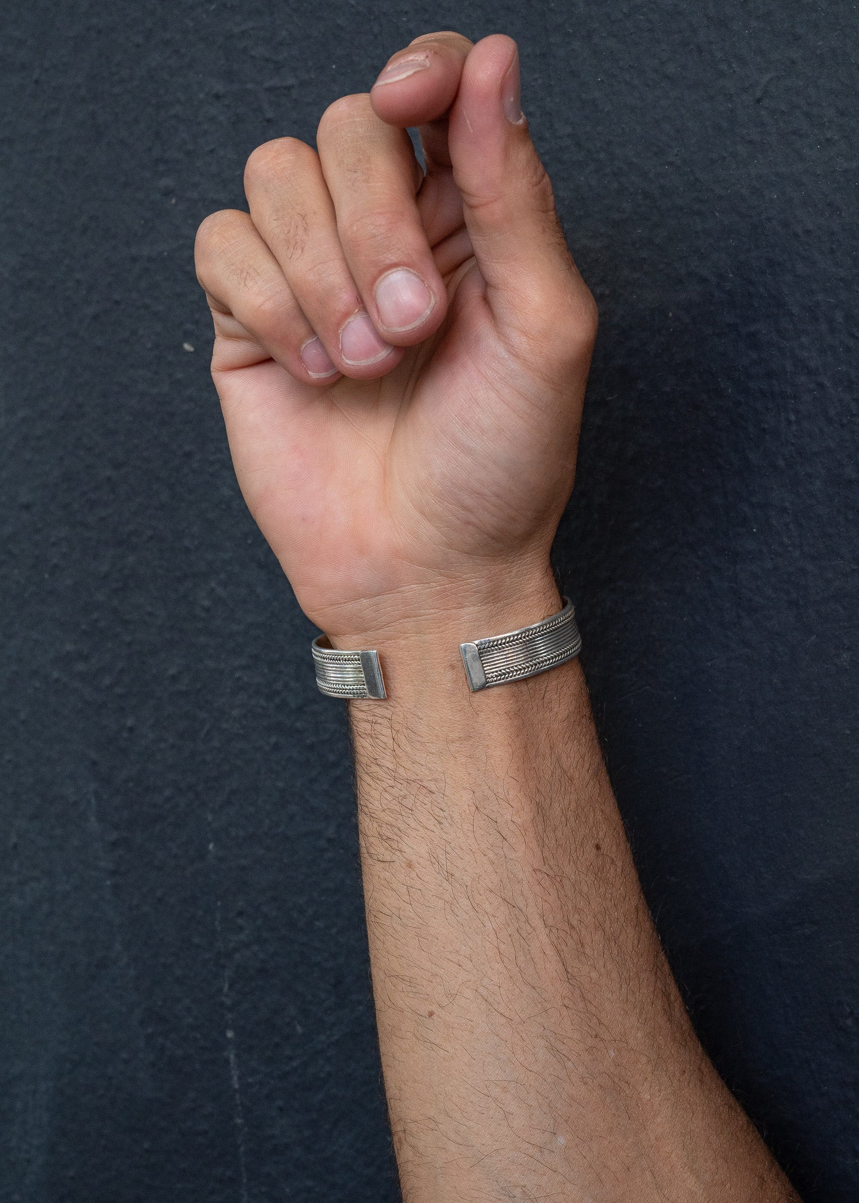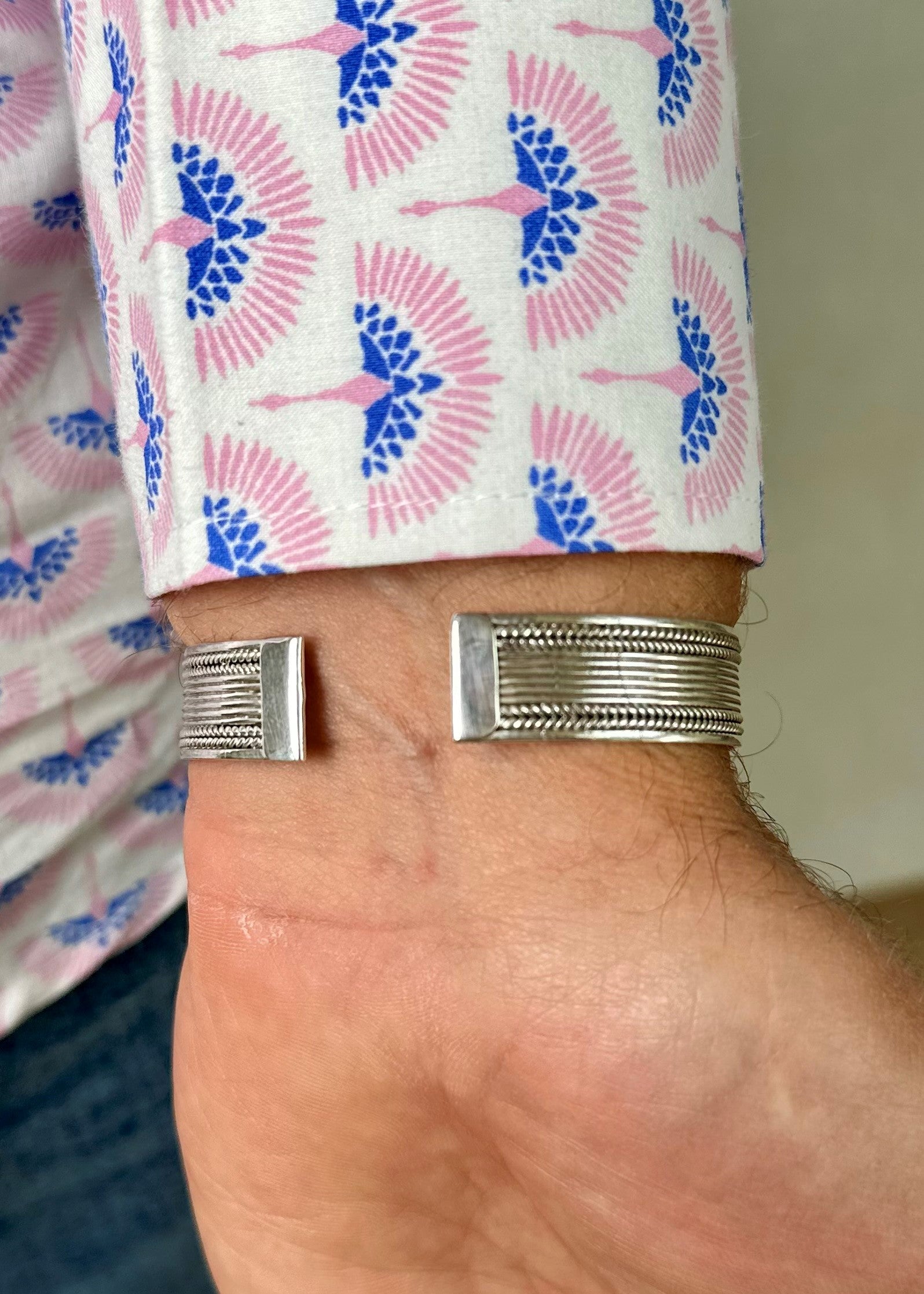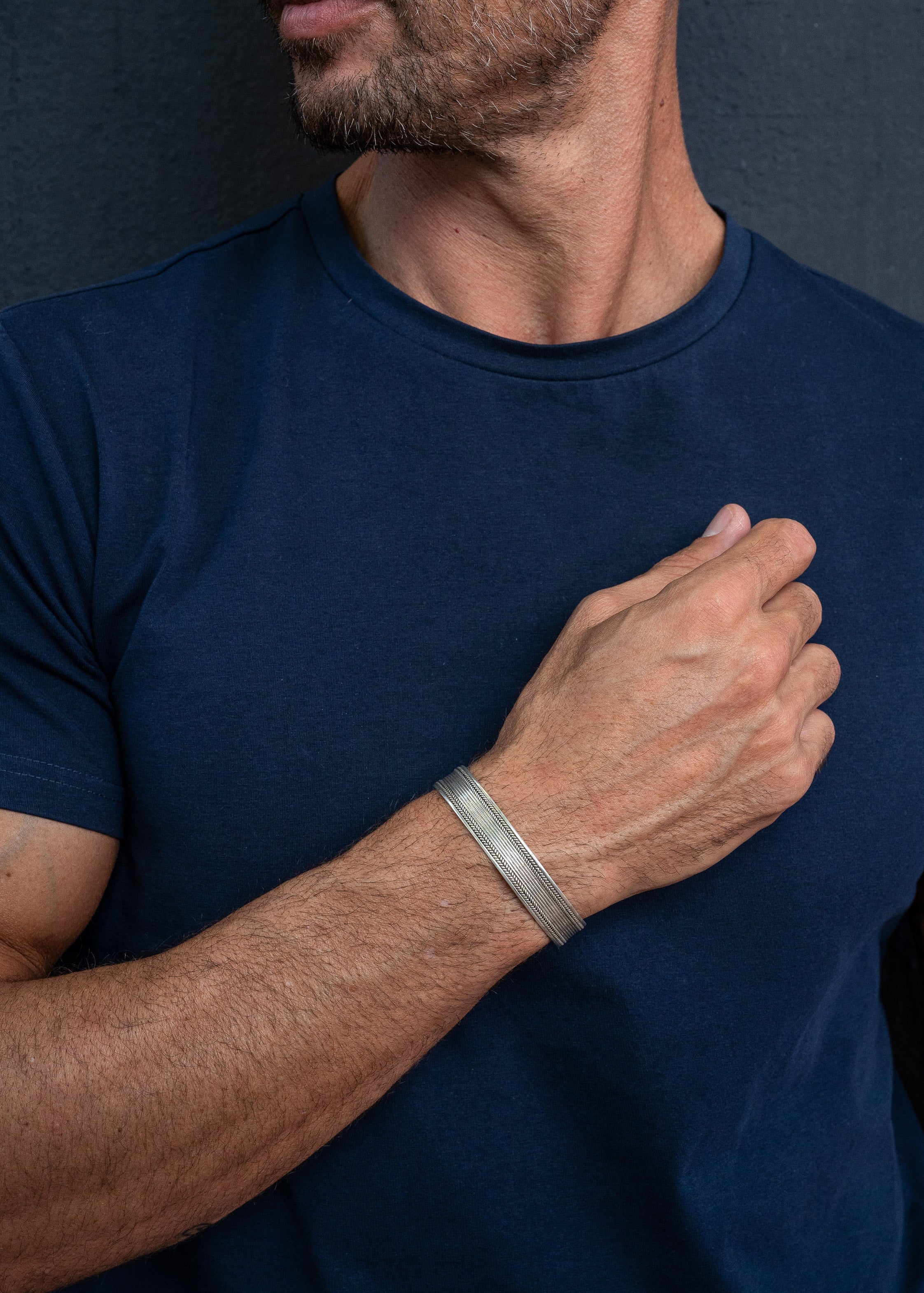 High quality handcrafted sleek silver open cuff with fine line pattern detail