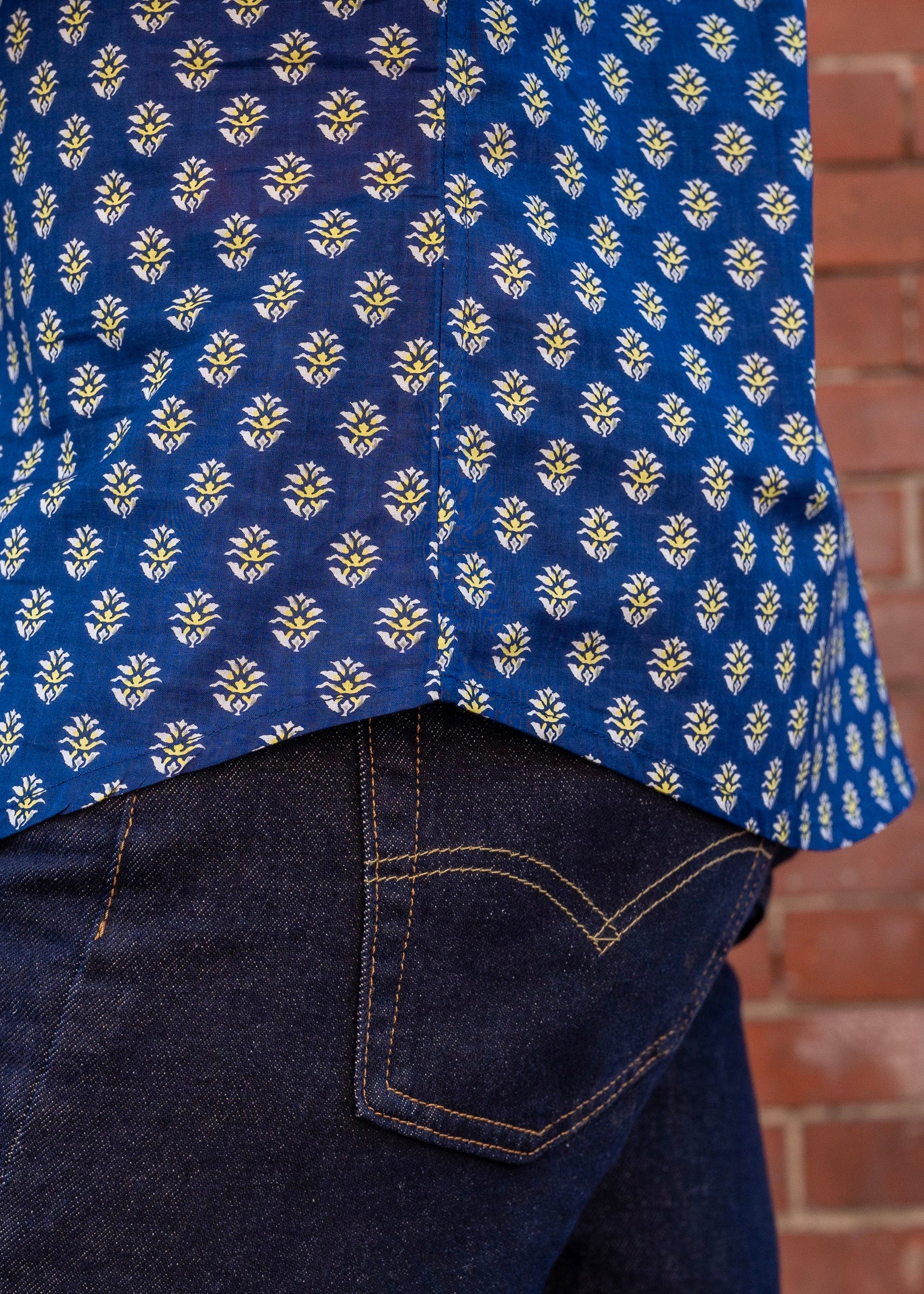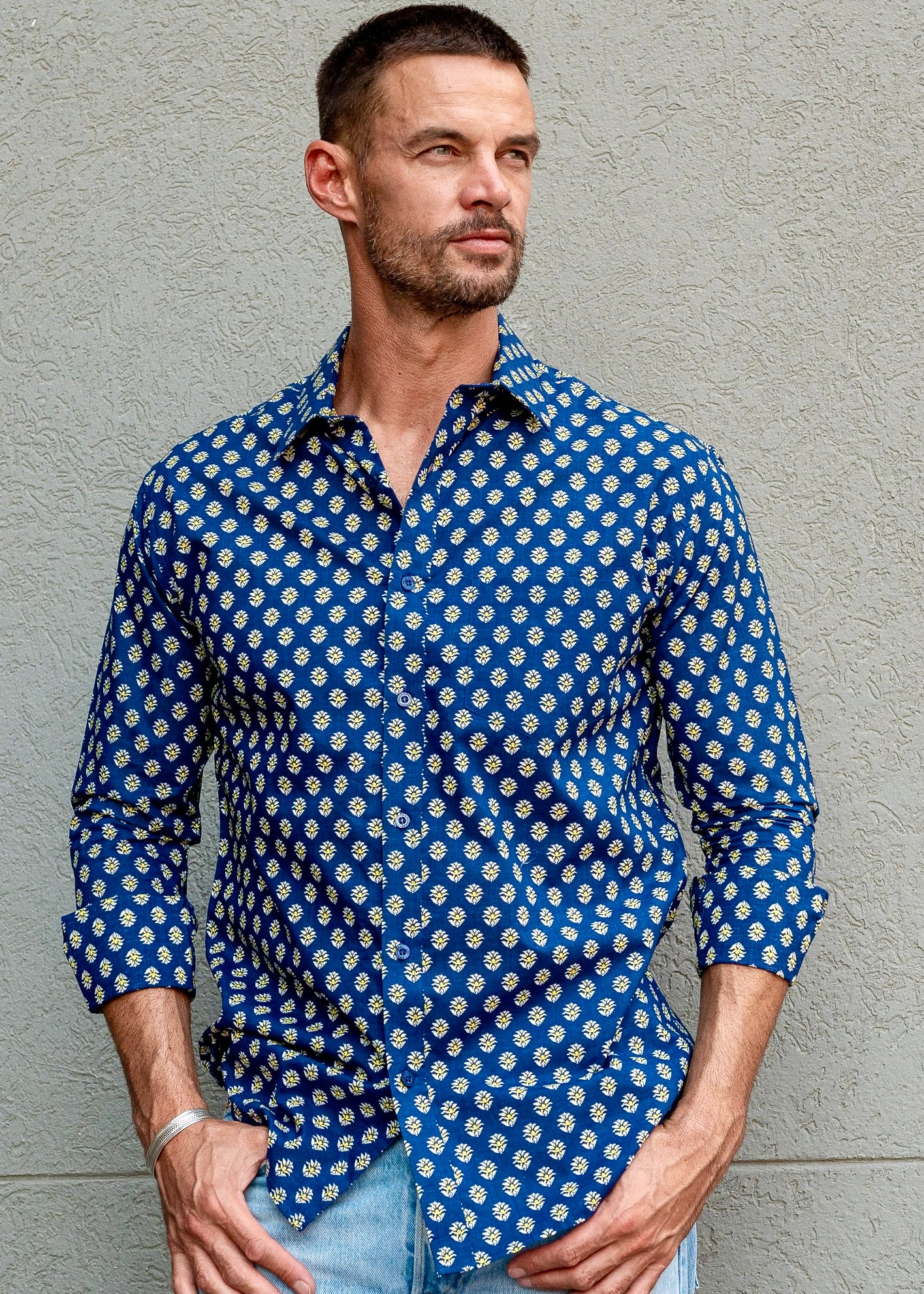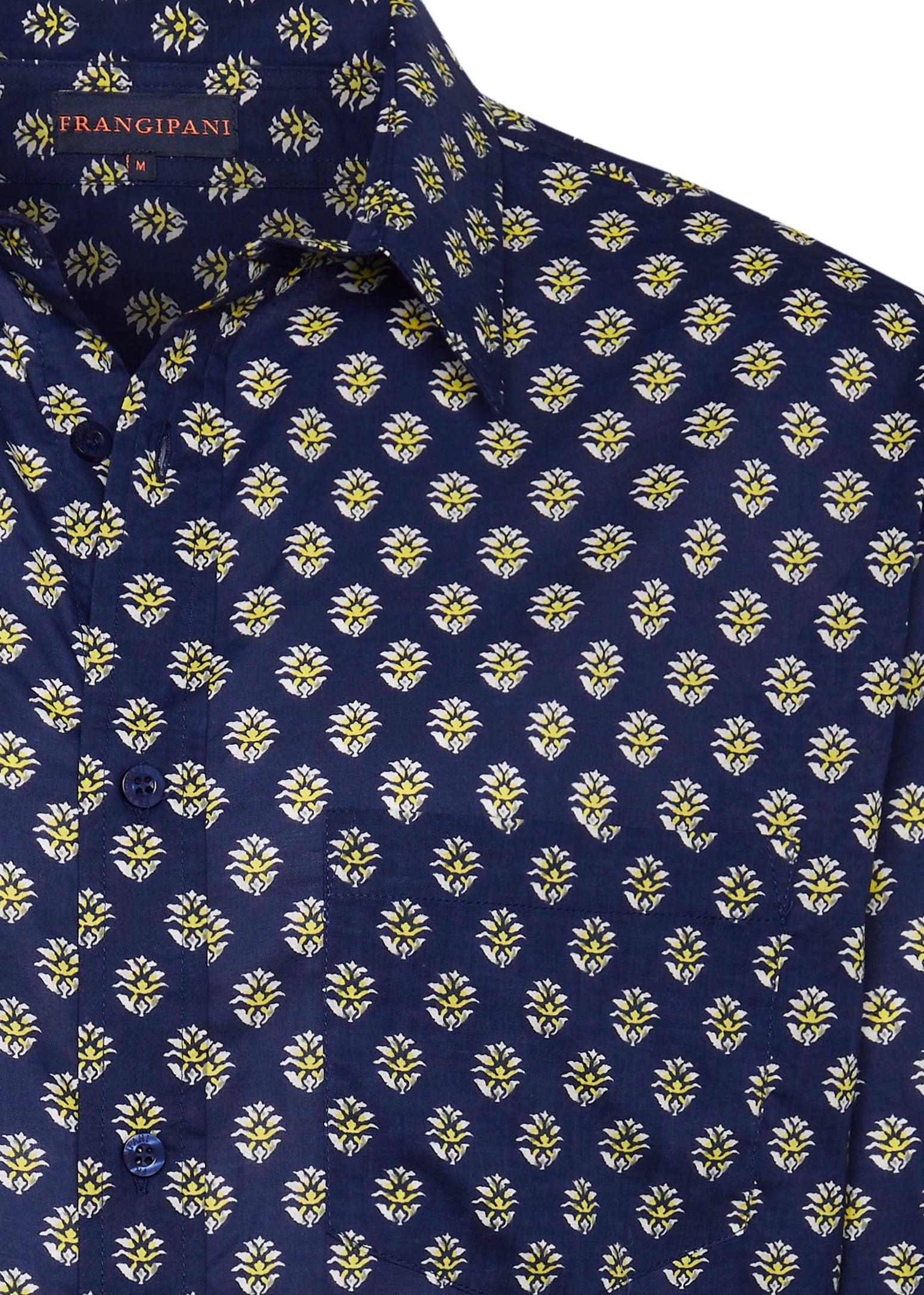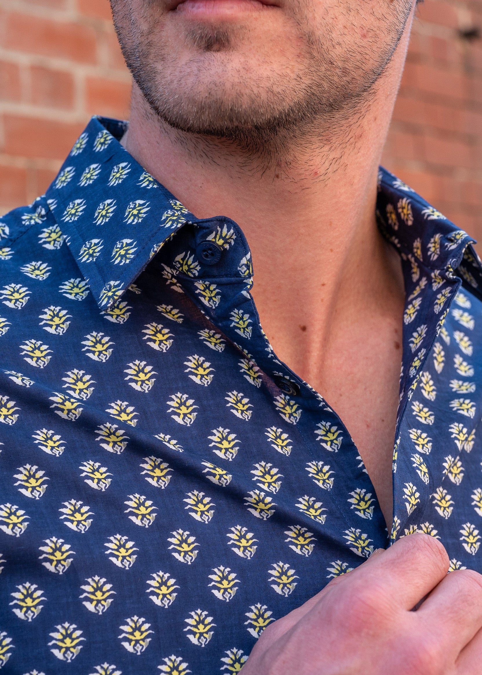 Featuring a vibrant print of delicate yellow and white flowers against a rich navy blue base, this shirt brings timeless elegance to your wardrobe.