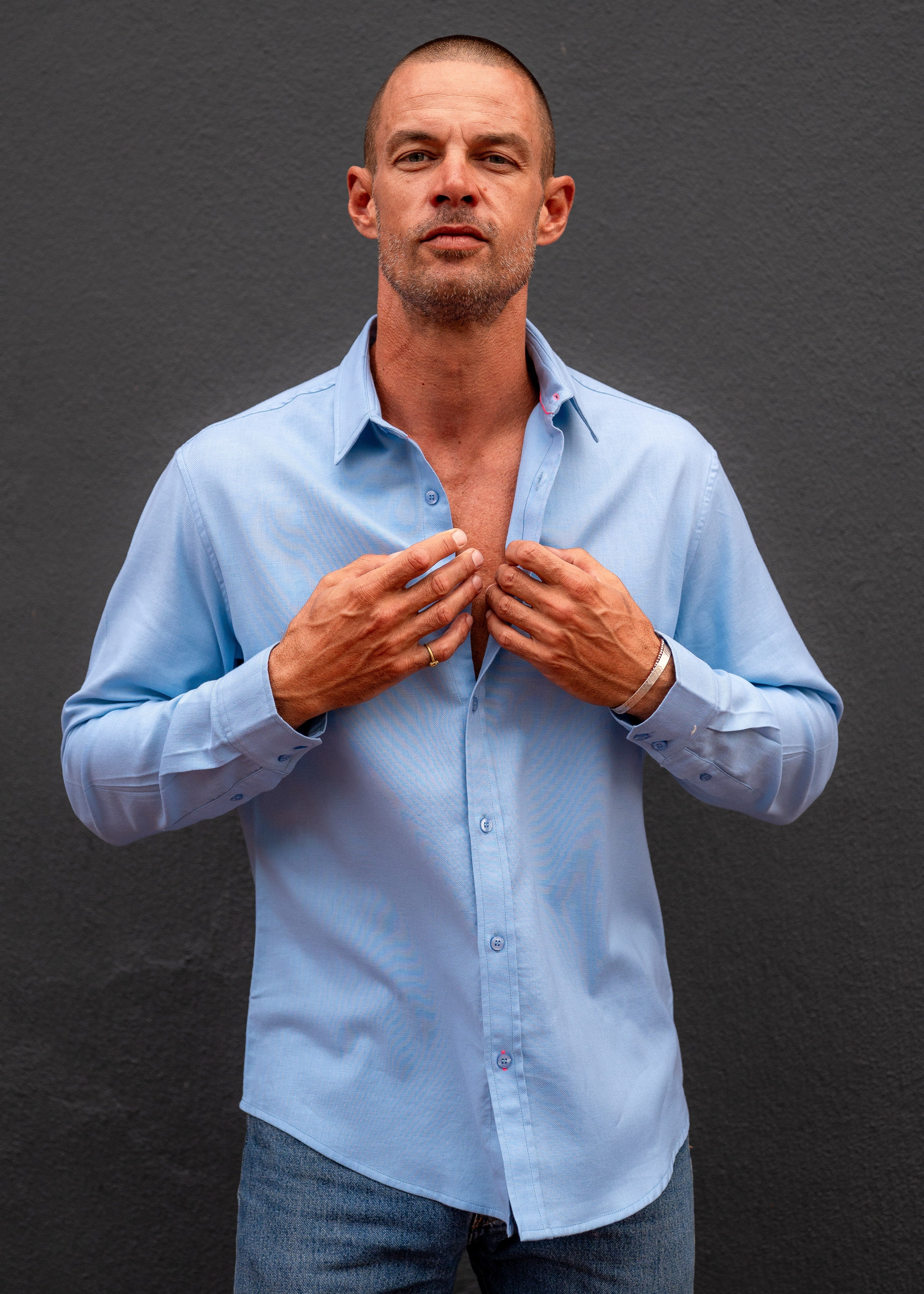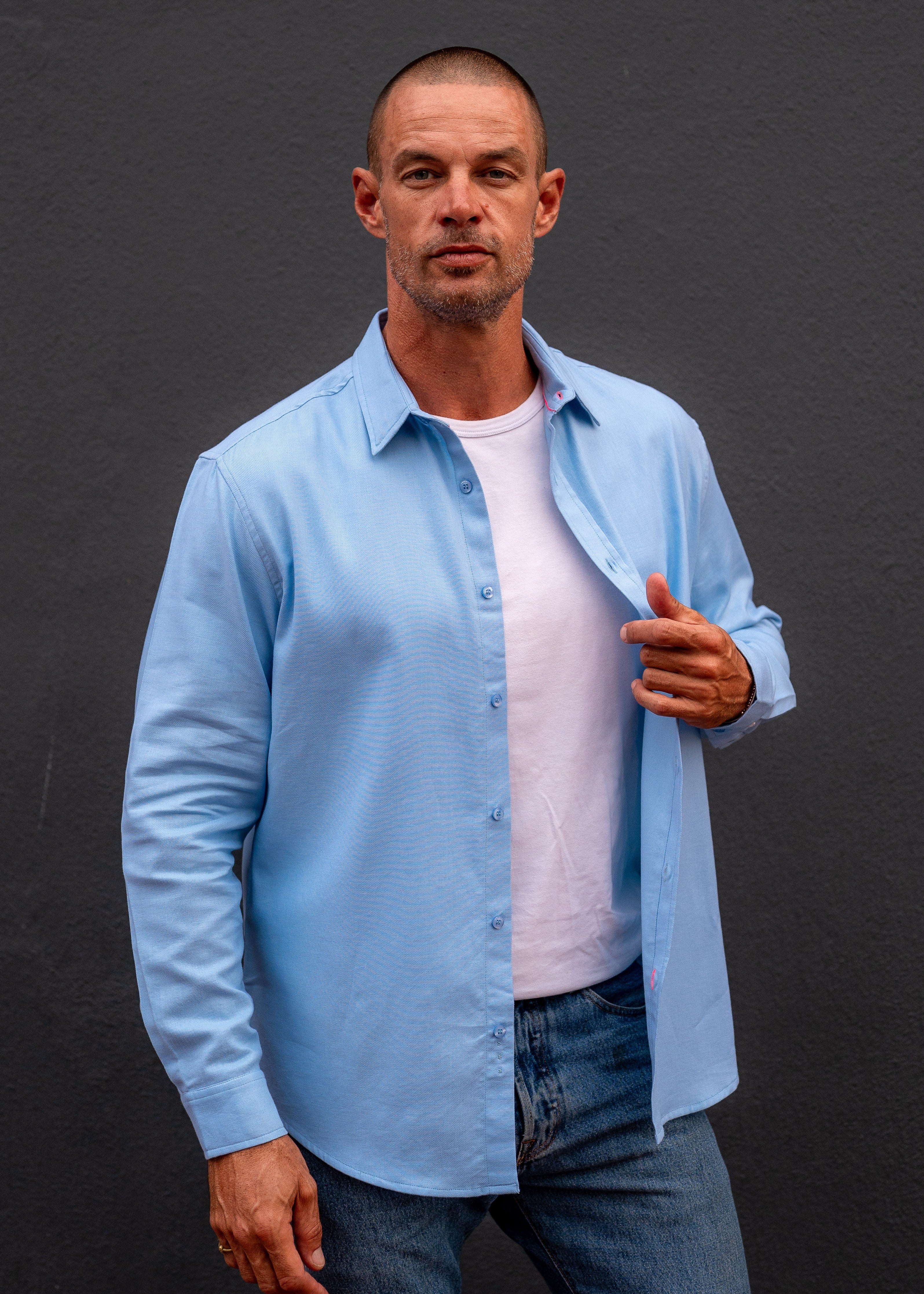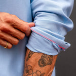 Ice Blue Flannel — clean, calm, but never quiet. Cut from soft brushed cotton and finished with sharp flashes of bright orange at the seams and cuffs, it’s the sort of shirt that only reveals its personality up close. Understated from across the room, unmistakably Frangipani within arm’s reach. Throw it over a tee for easy days or button it up when the evening starts behaving itself — either way, it’s doing more work than it lets on.