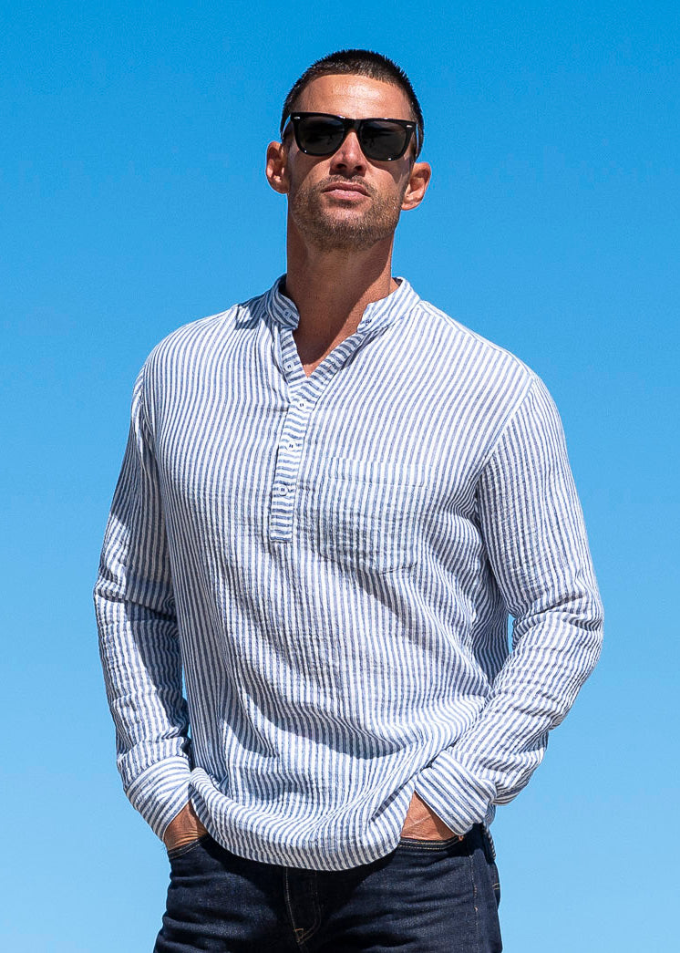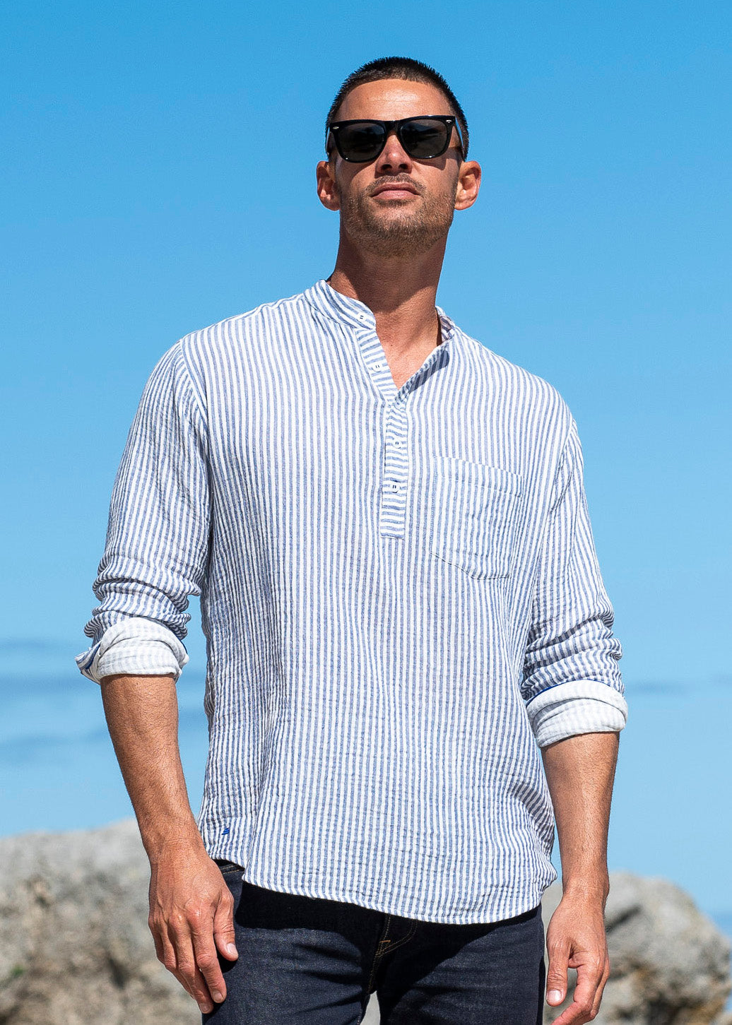 Twice as Nice Mens' Half Placket Cotton Shirt in Ocean Stripe