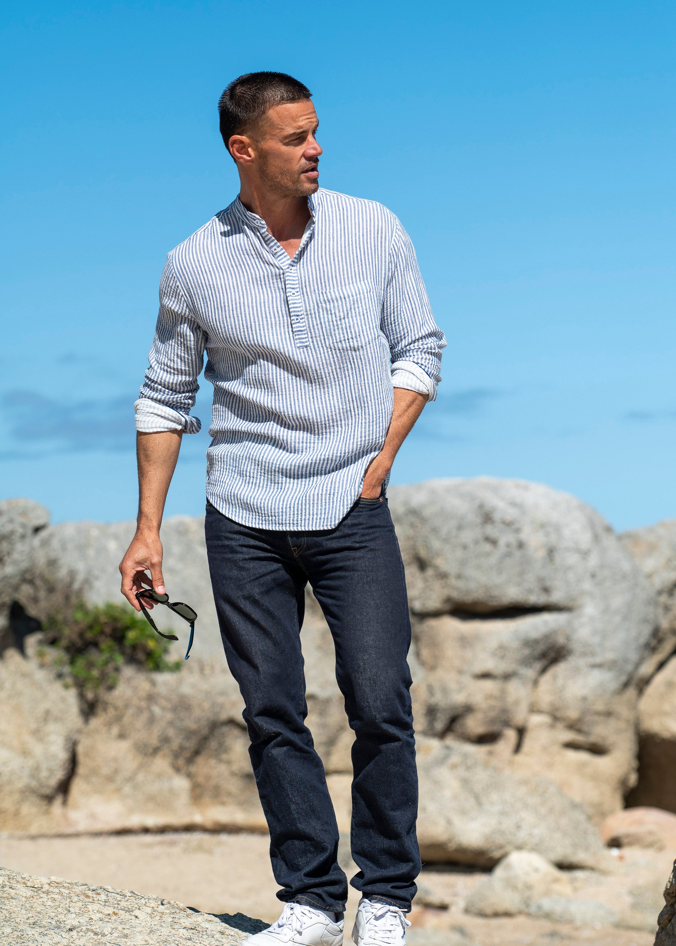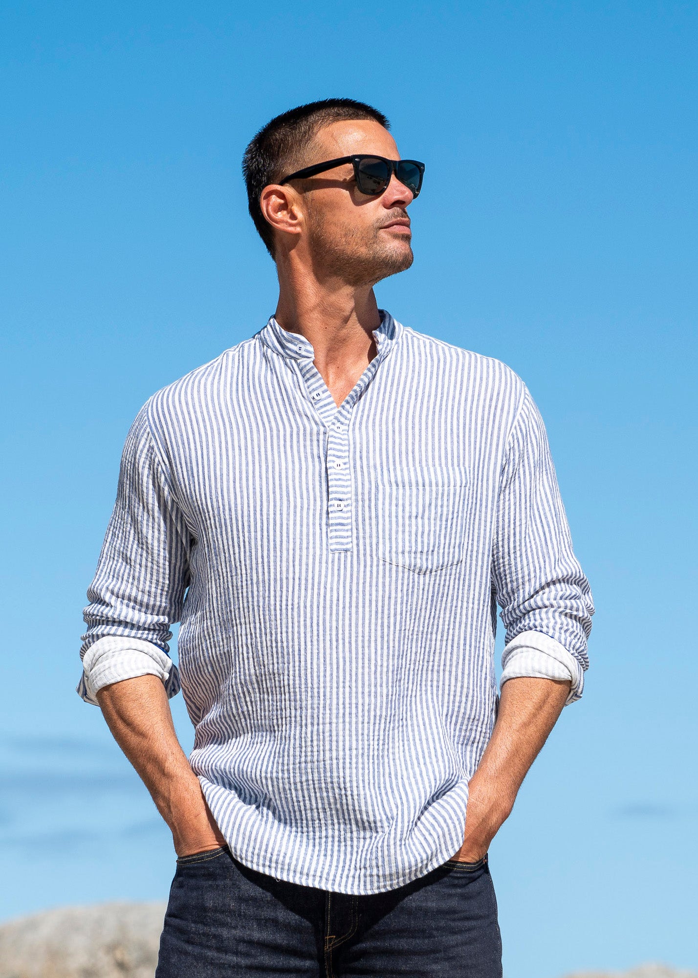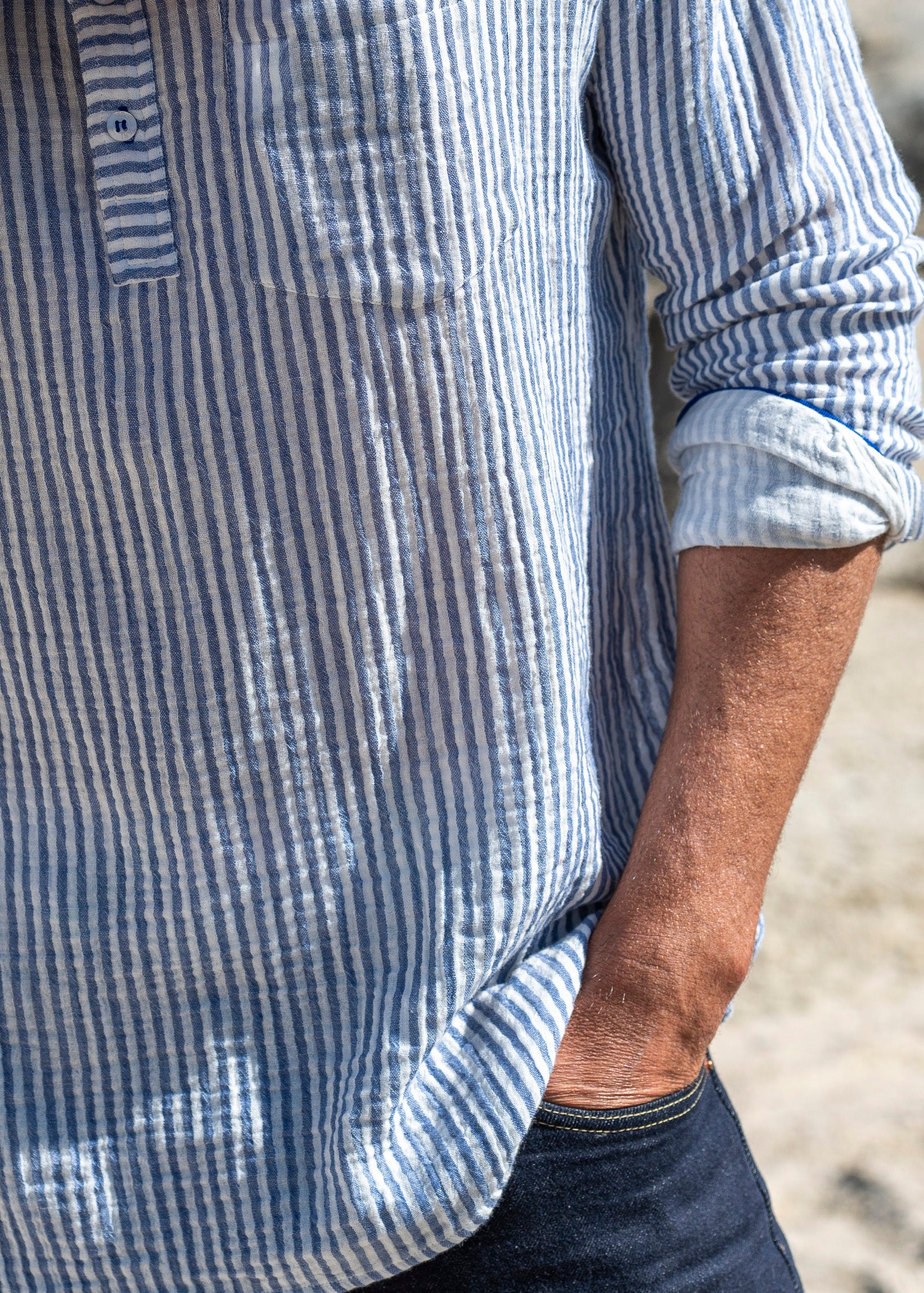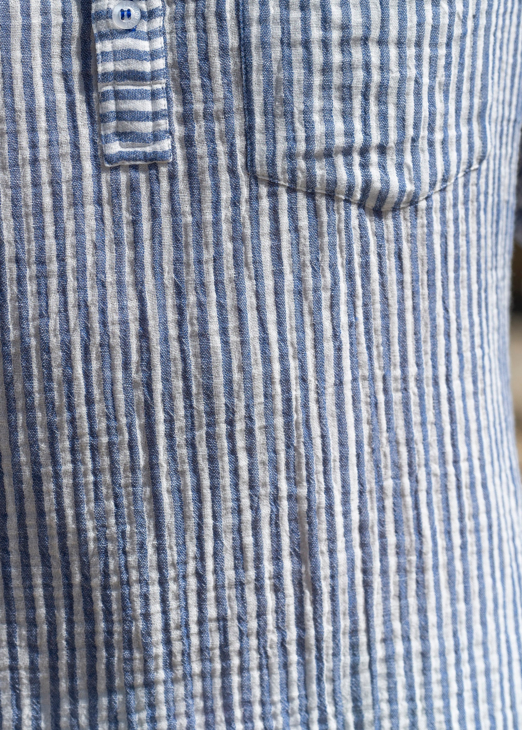 In a washed double-faced stripe cotton gauze for a soft, and gently crinkled feel.