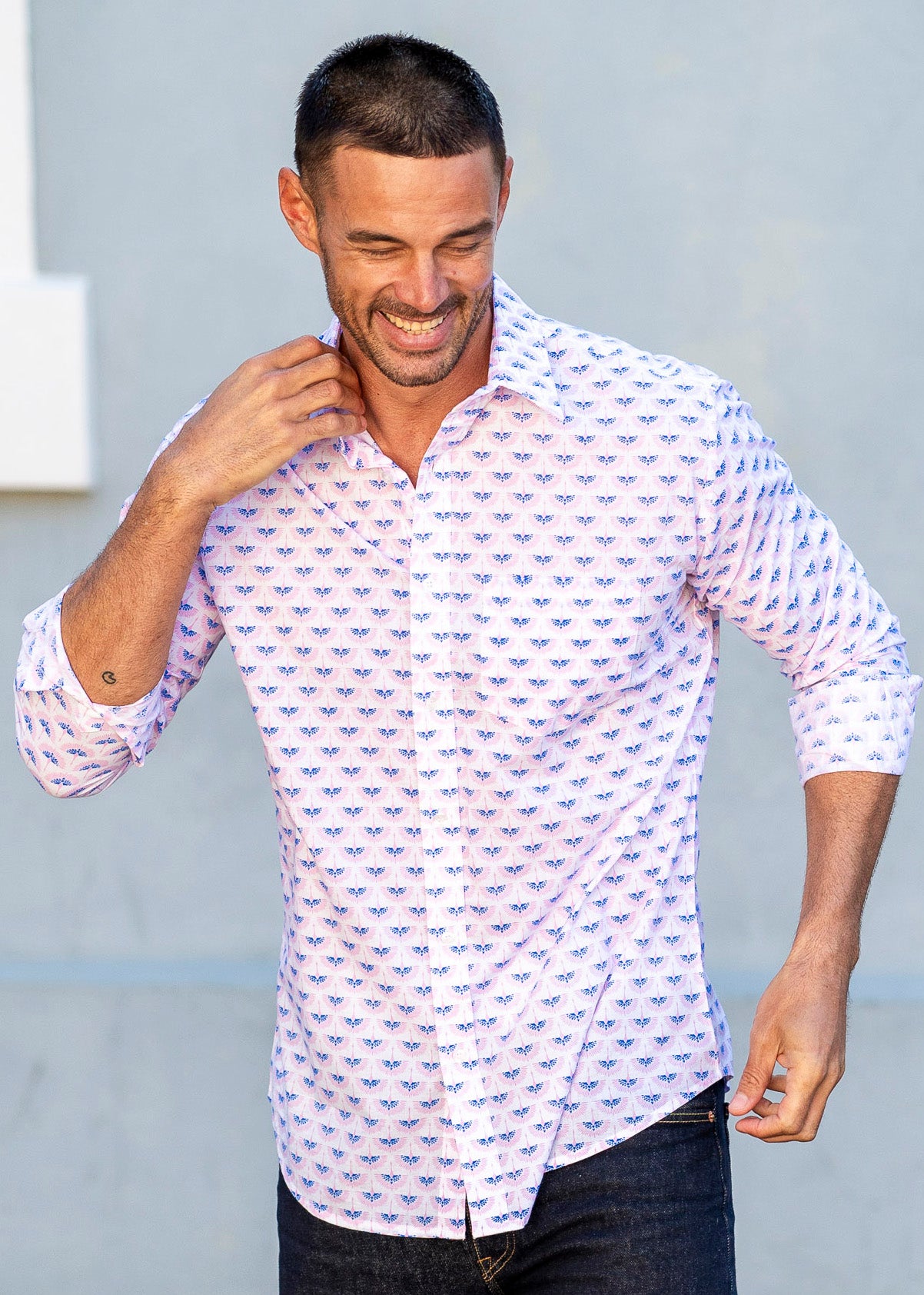 With a vibrant screen print of pink and blue cranes soaring in harmony on a fresh white background, this shirt offers a bold yet refined look perfect for any occasion.
