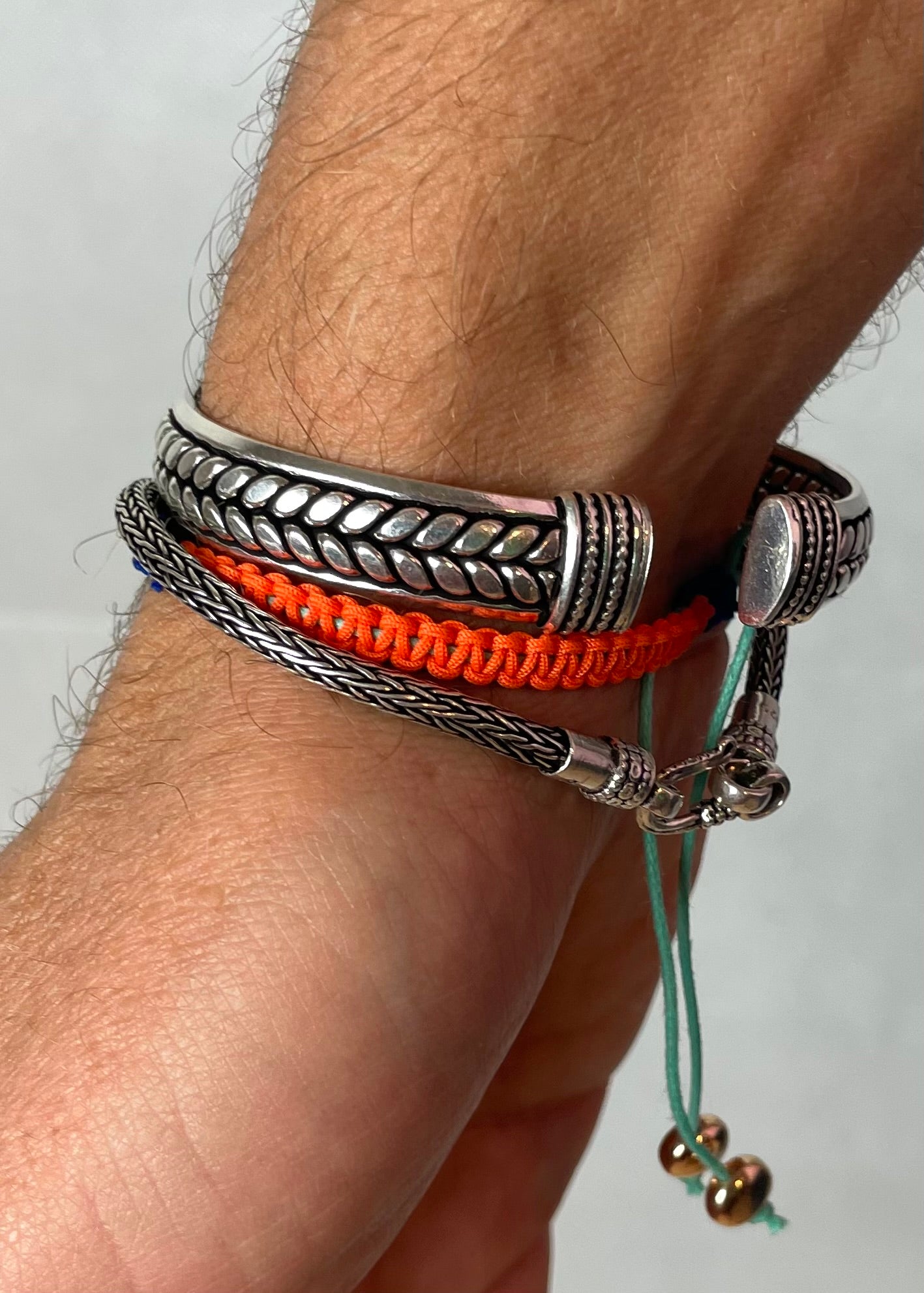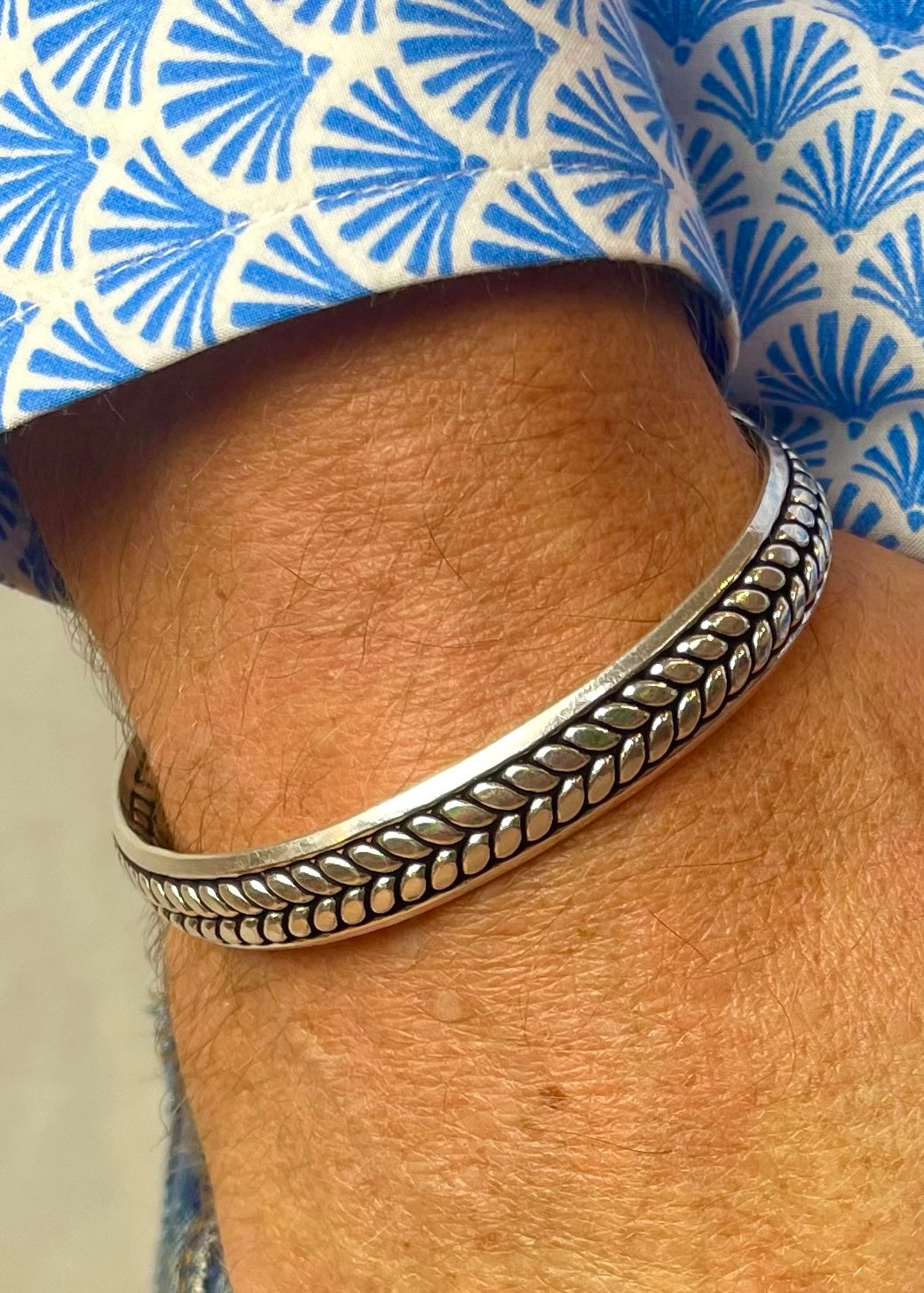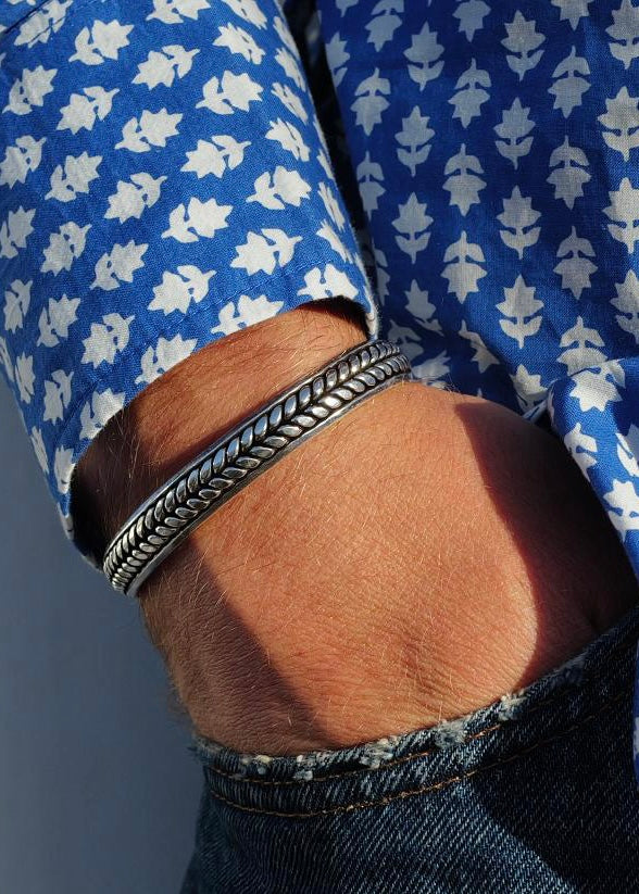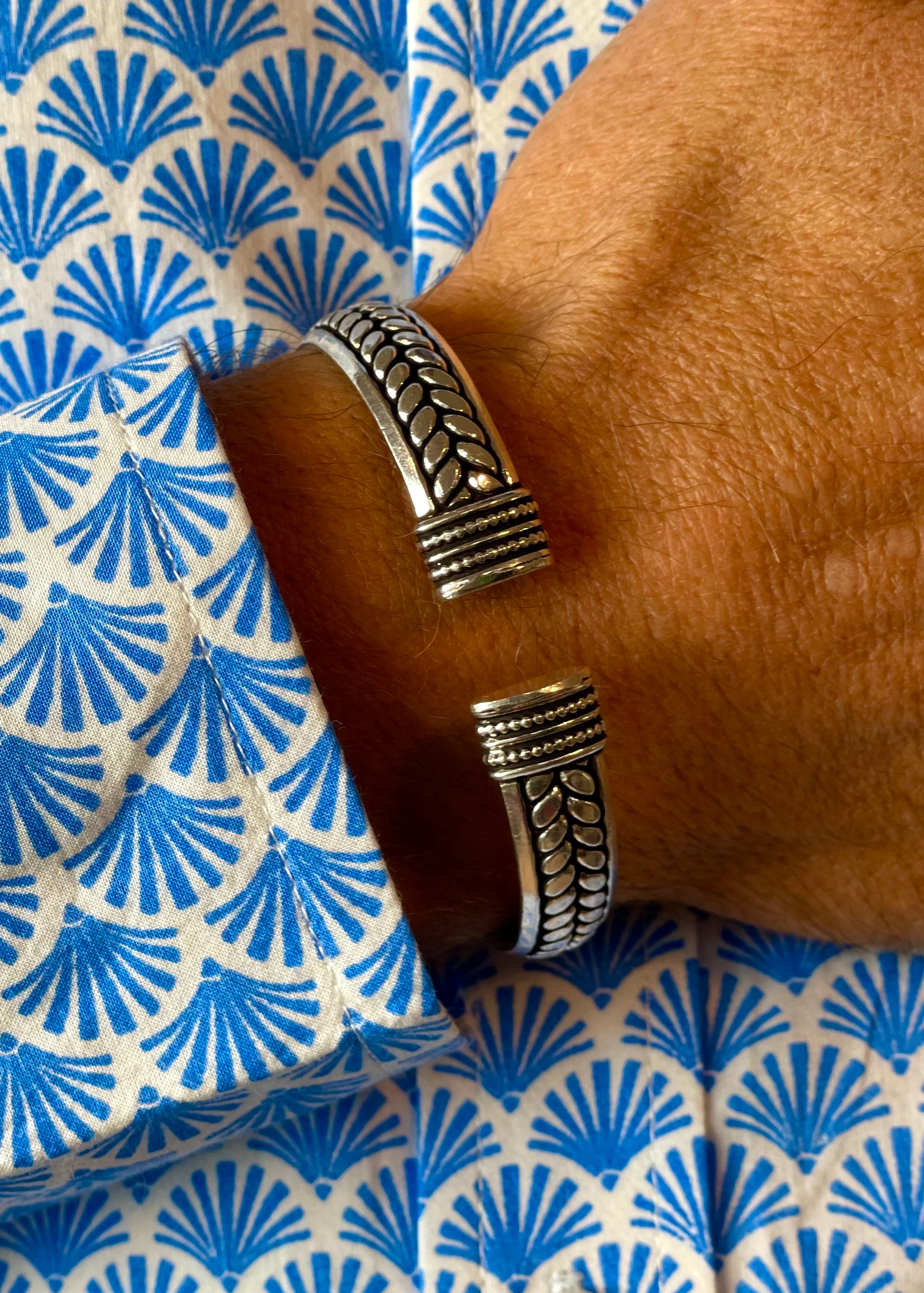 A mid-weight plaited solid silver cuff bracelet. Hand-made in Rajasthan by master craftsmen,