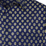 Featuring a vibrant print of delicate yellow and white flowers against a rich navy blue base, this shirt brings timeless elegance to your wardrobe.
