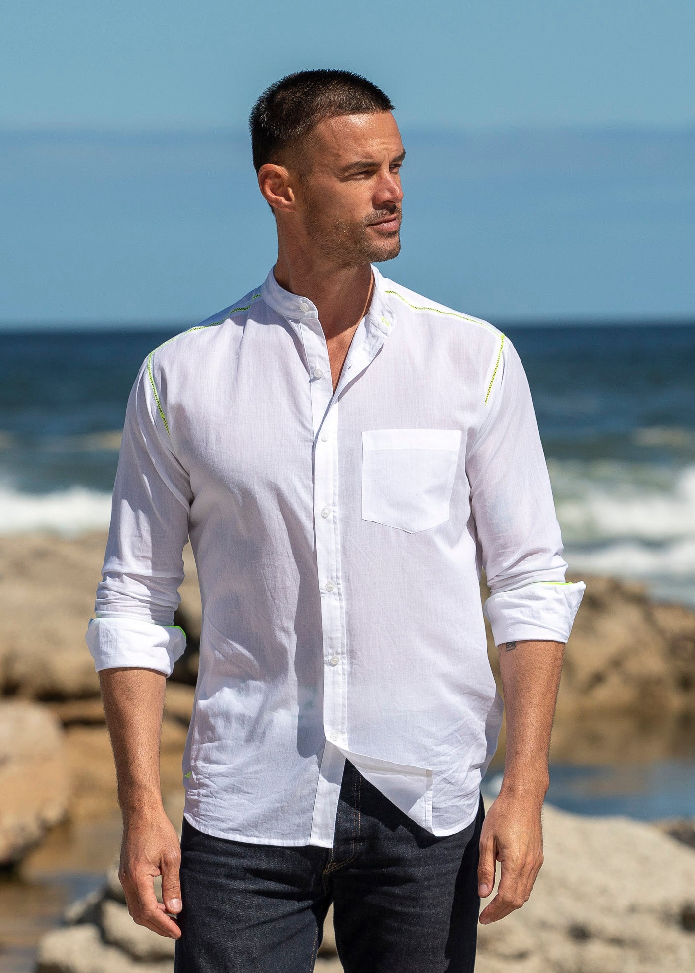 Finest lightweight cotton voile shirt with classic Nehru collar for relaxed holiday vibe with contrast neon flashes for a unique point of difference.