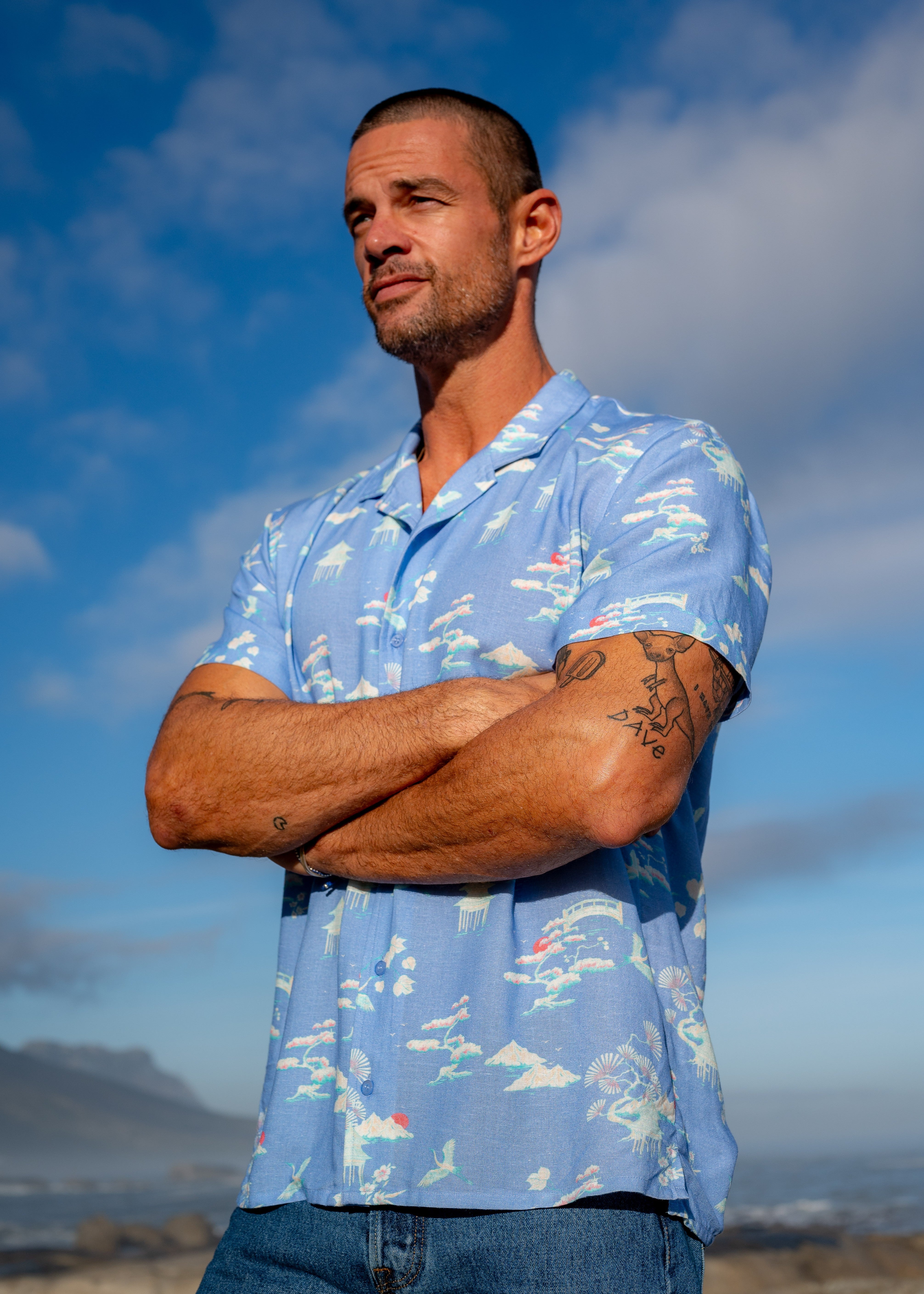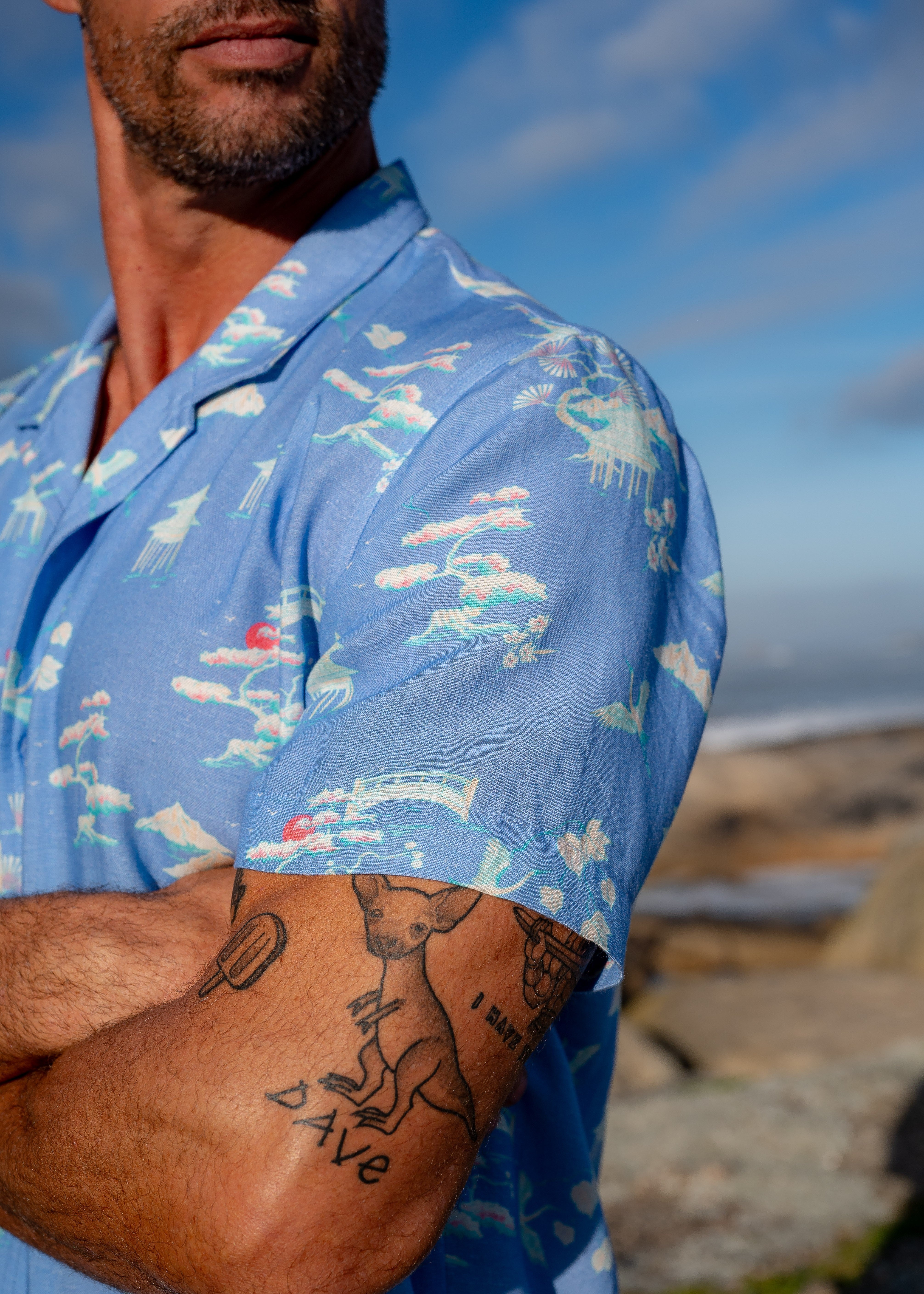 Crafted from a soft and breathable linen viscose blend, Oriental Amaze is going to be your go to shirt for the heatwaves to come... Set against a rich sky blue base, it features a delicate print of pagodas, cranes, bonsai trees, and distant mountains—drawing inspiration from classic East Asian landscapes.
