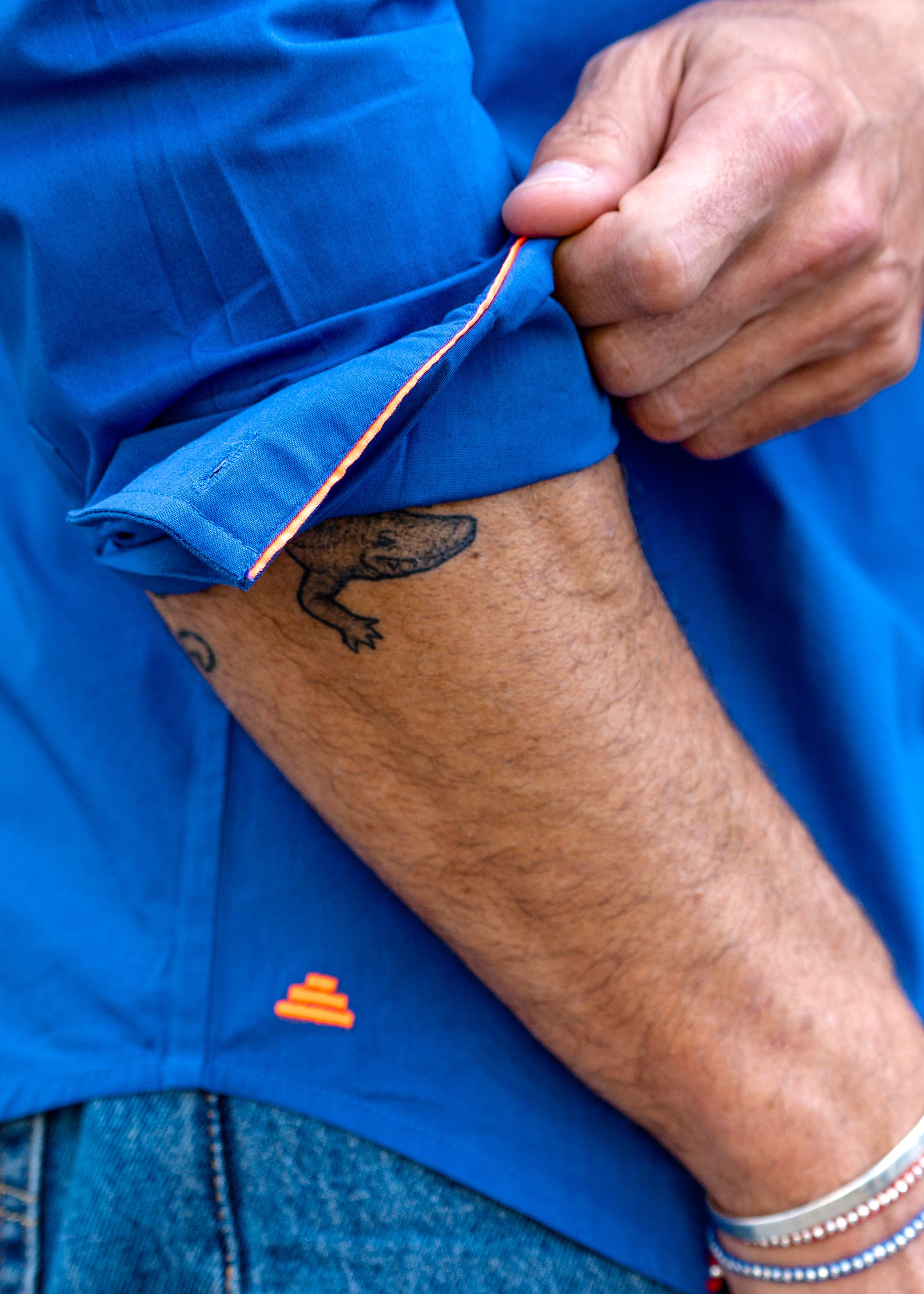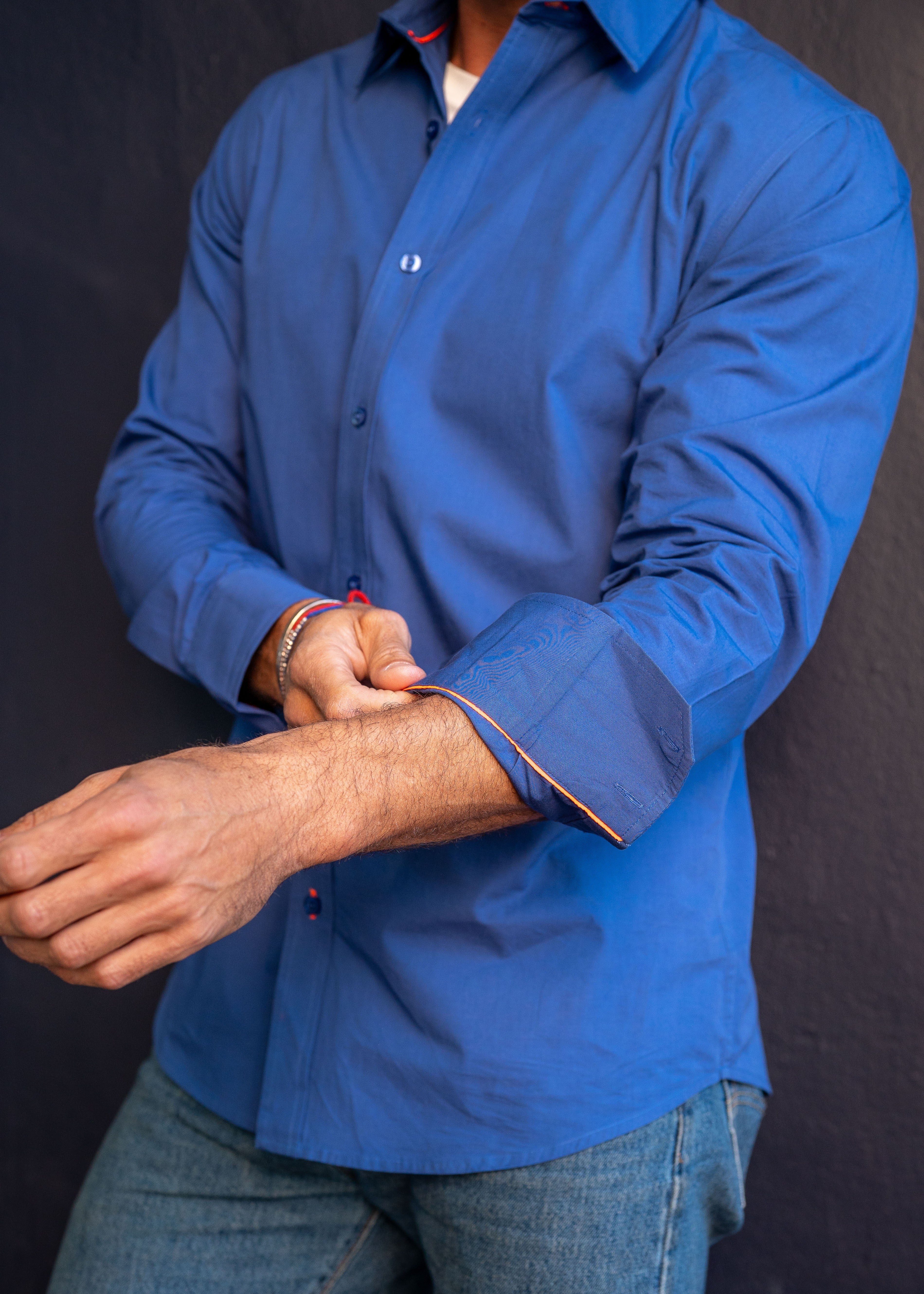 Minimalist at first glance, electric at second. Cut from crisp violet blue poplin cotton, this shirt balances effortless cool with a hidden jolt of energy.