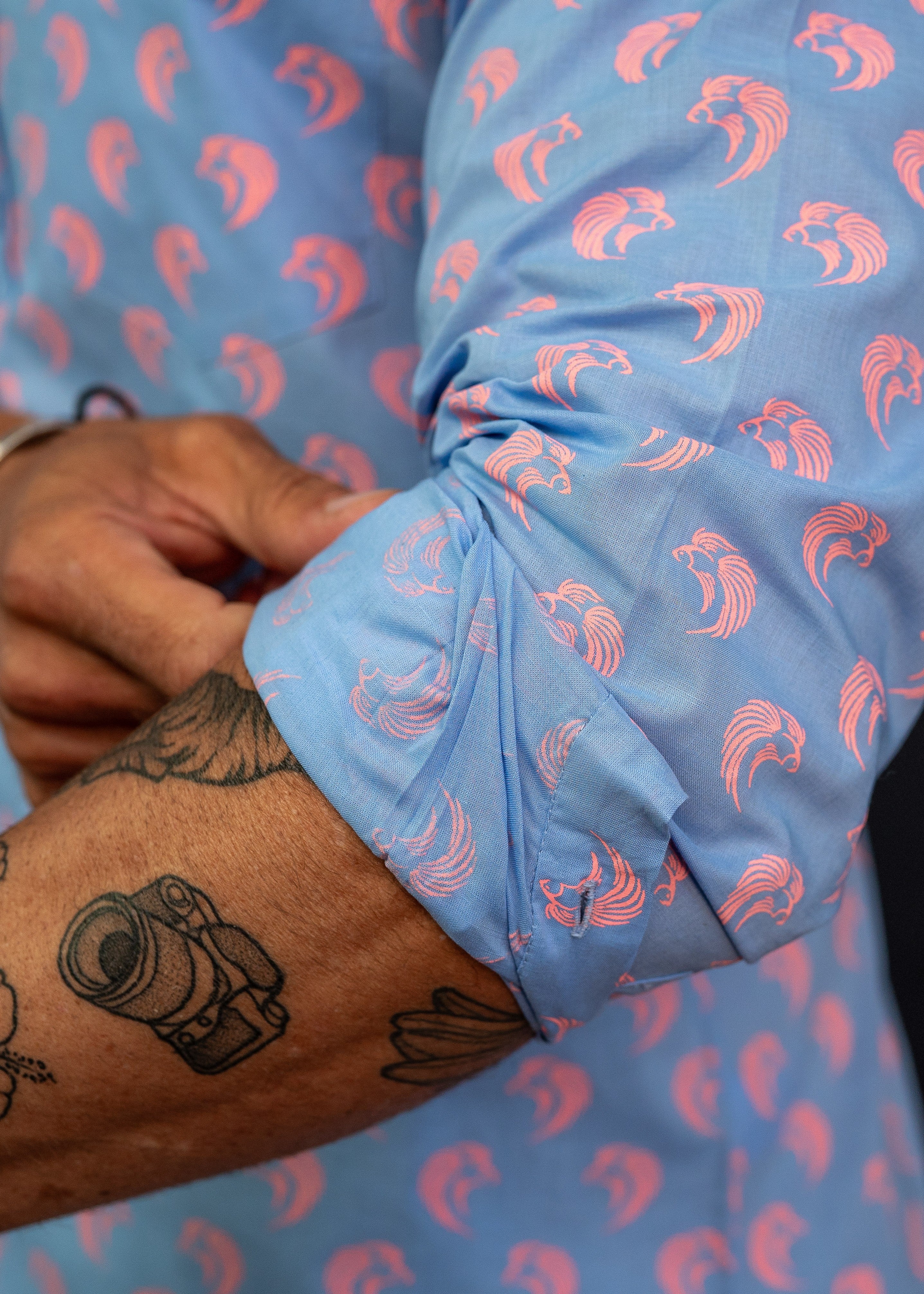 Inspired by the hypnotic beauty of the Siamese fighting fish, Siamese Sunrise captures the balance between elegance and vitality. The print features these extraordinary creatures — known for their vivid colour and fearless spirit — gliding across a sky-blue base in coral-pink flashes.