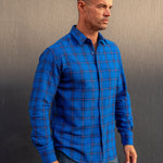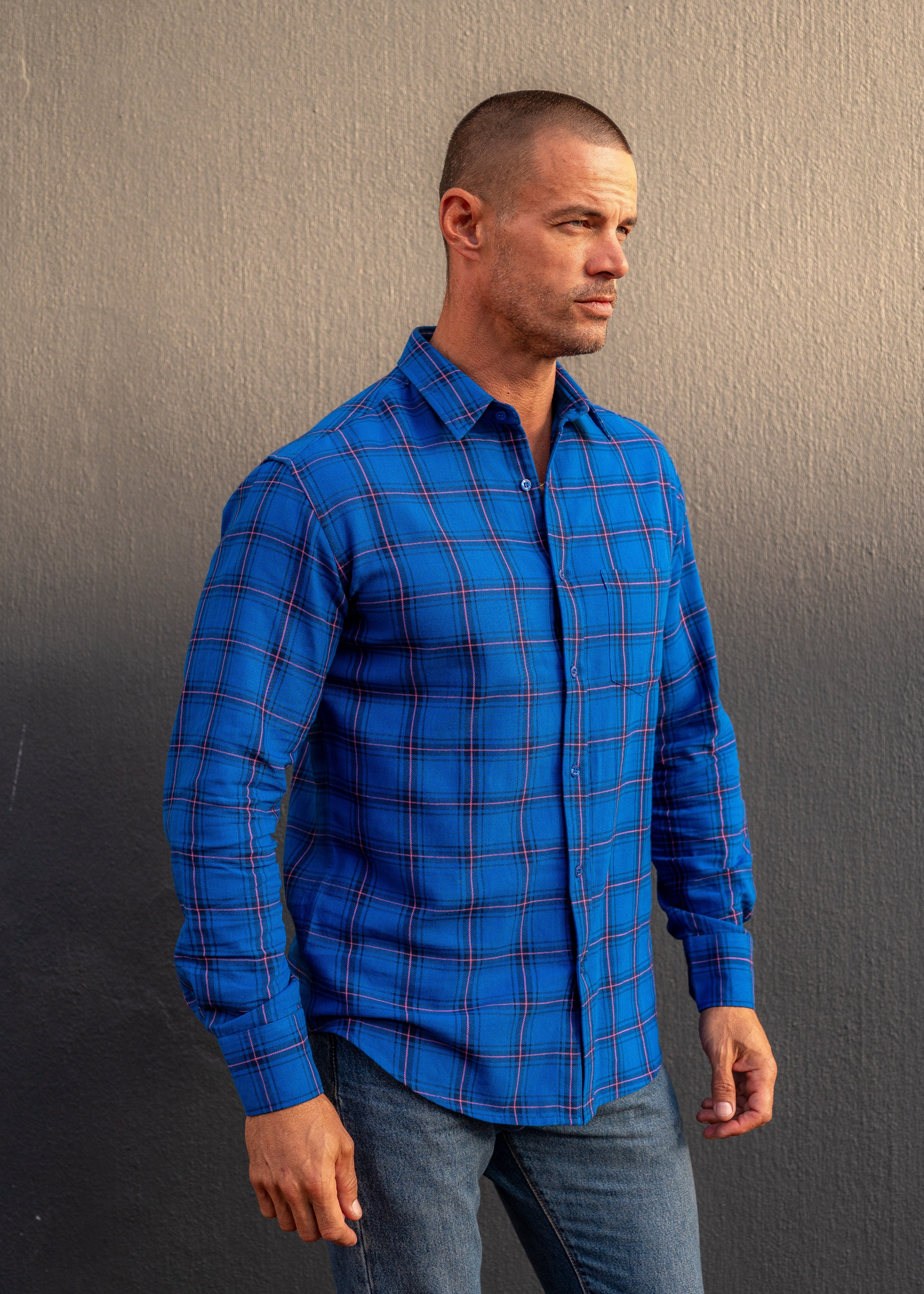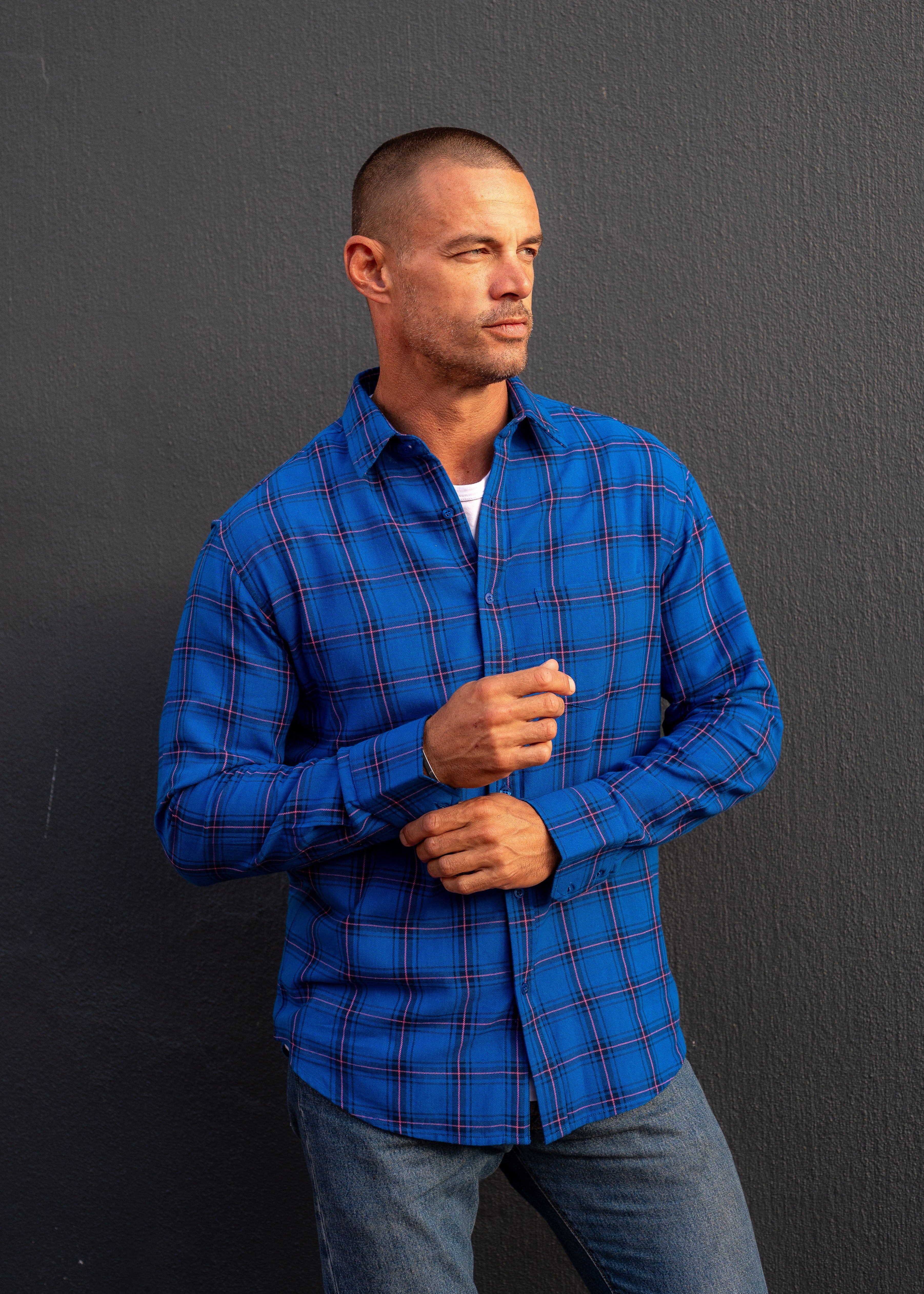 Meet The Underboss — a statement check shirt made from mid-weight brushed cotton flannel. Soft, warm, and built for autumn, it’s the perfect blend of comfort and confidence. The cobalt blue base is shot through with fine pink and navy lines, giving it a bold, refined edge that stands out without shouting.