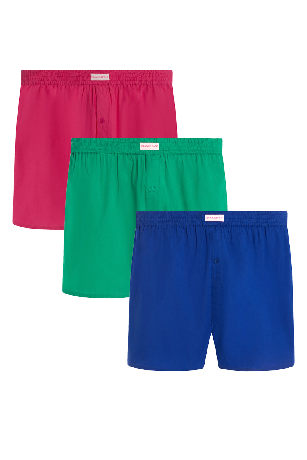 This triple pack boxer combo features our Electric Blue, Super Pink & Emerald Green plain boxer shorts.