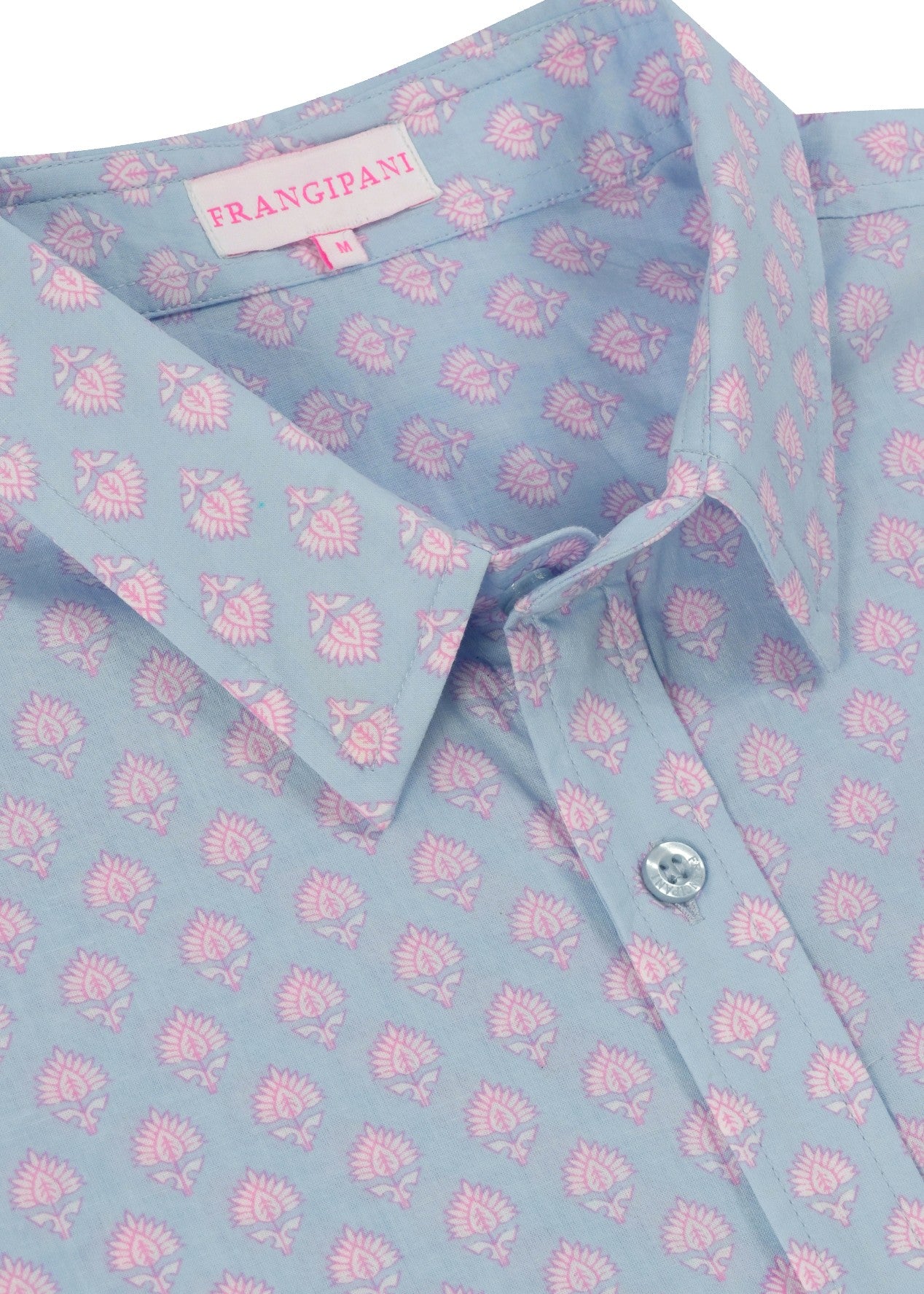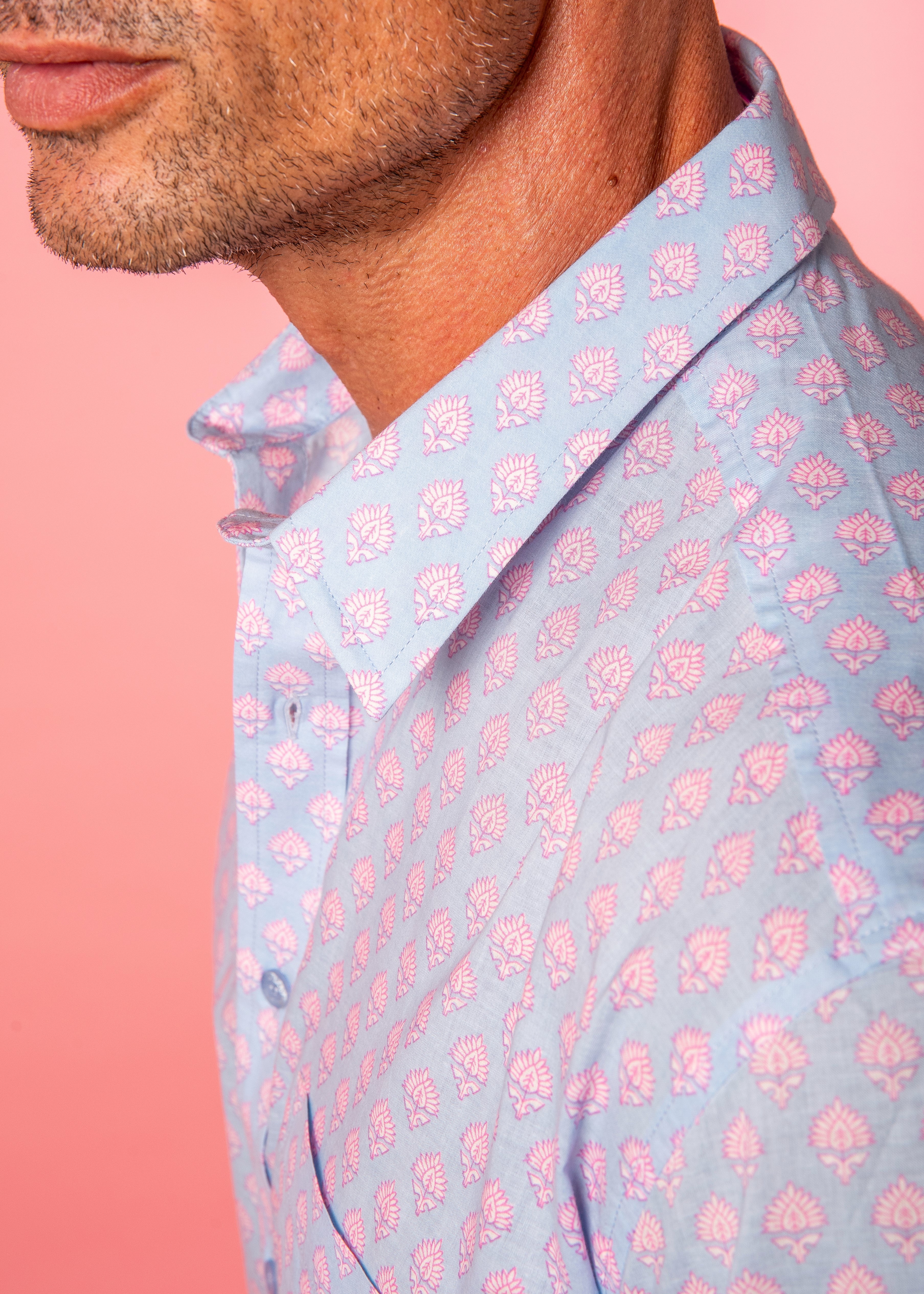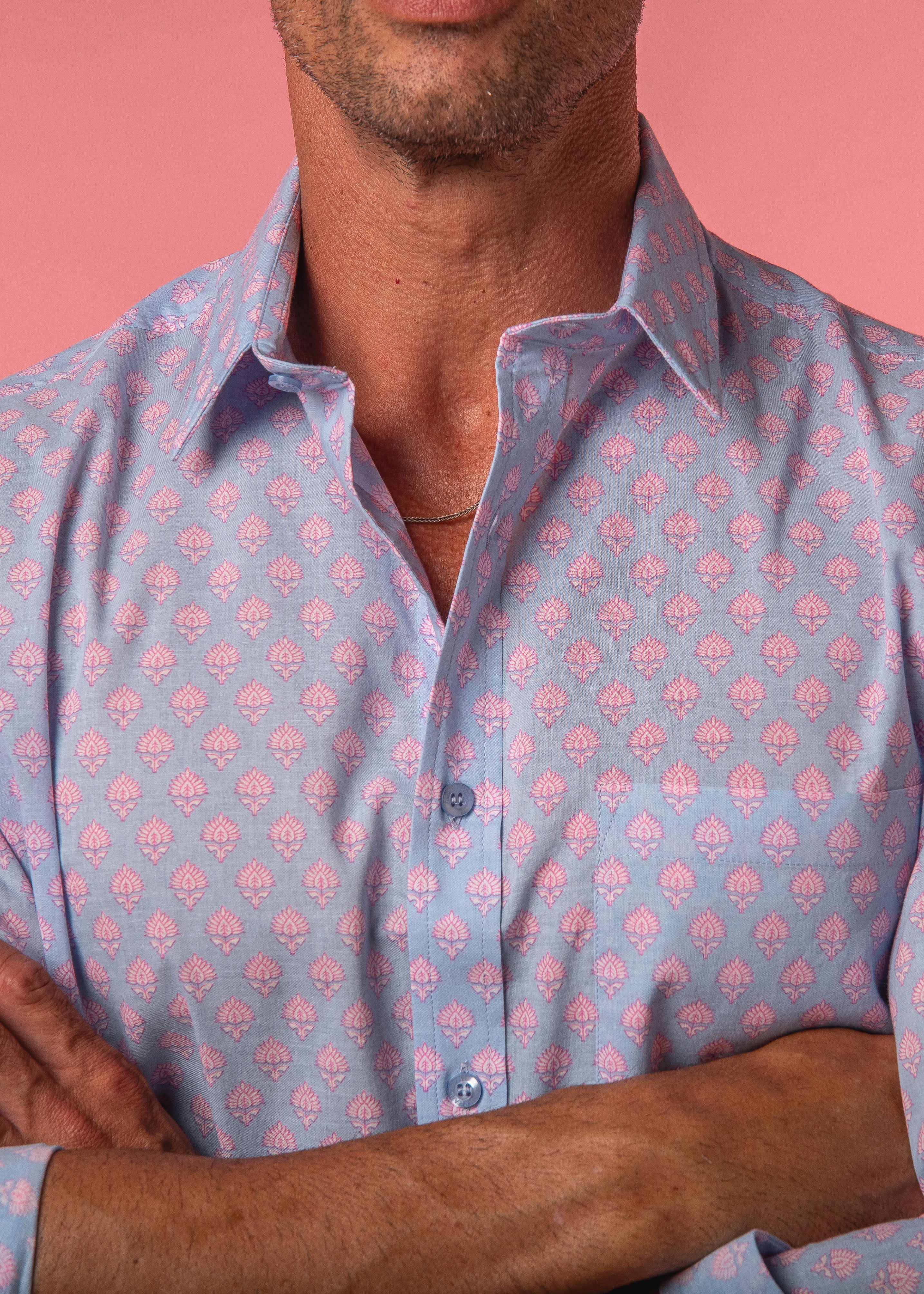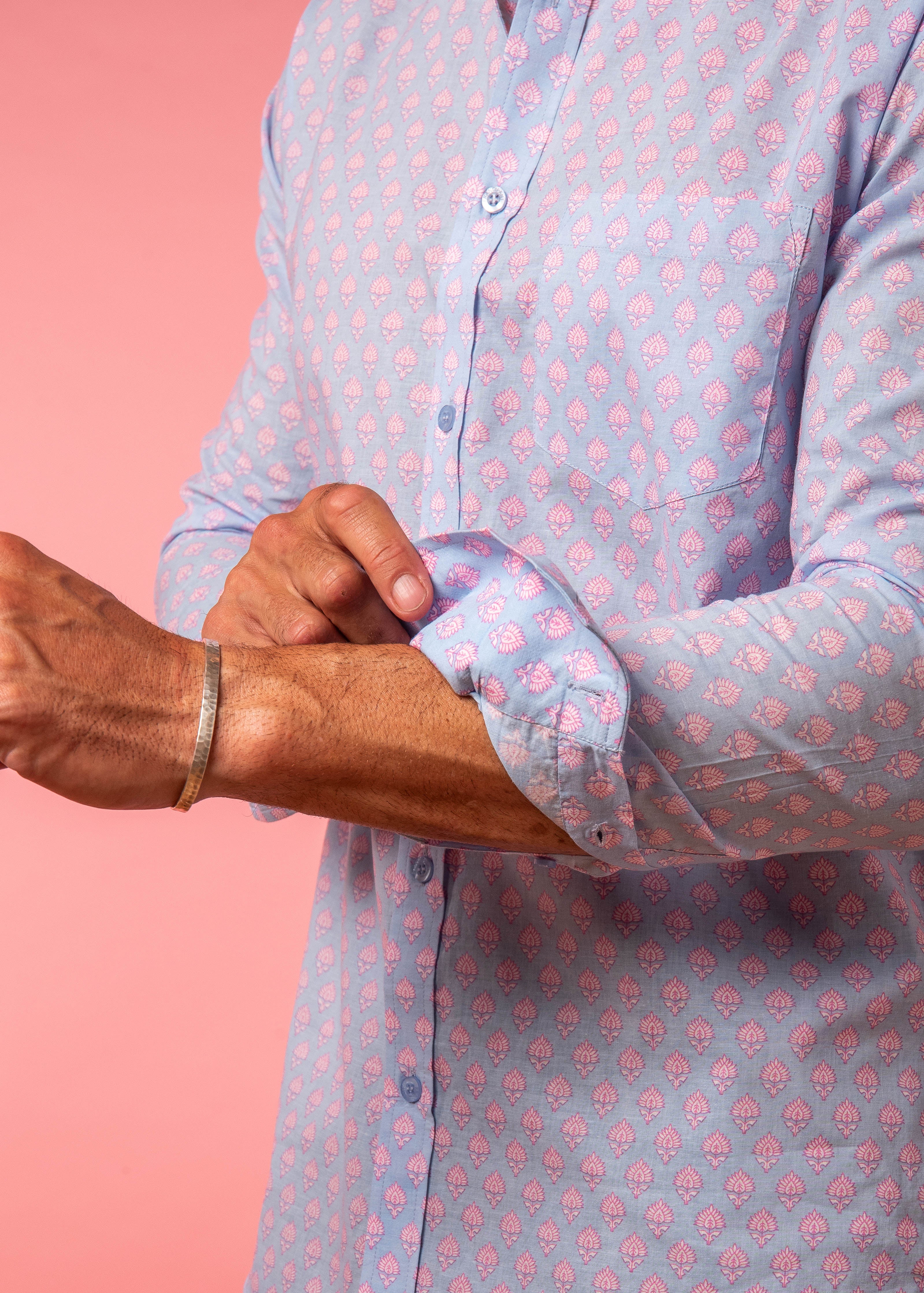 Inspired by the intricate craftsmanship of Rajasthani block printing, this shirt gives heritage design a bright, contemporary lift. The pink floral motif, screen printed on a soft sky-blue base, brings out richness and clarity you don’t often find in traditional fabric — a quiet standout with serious style.