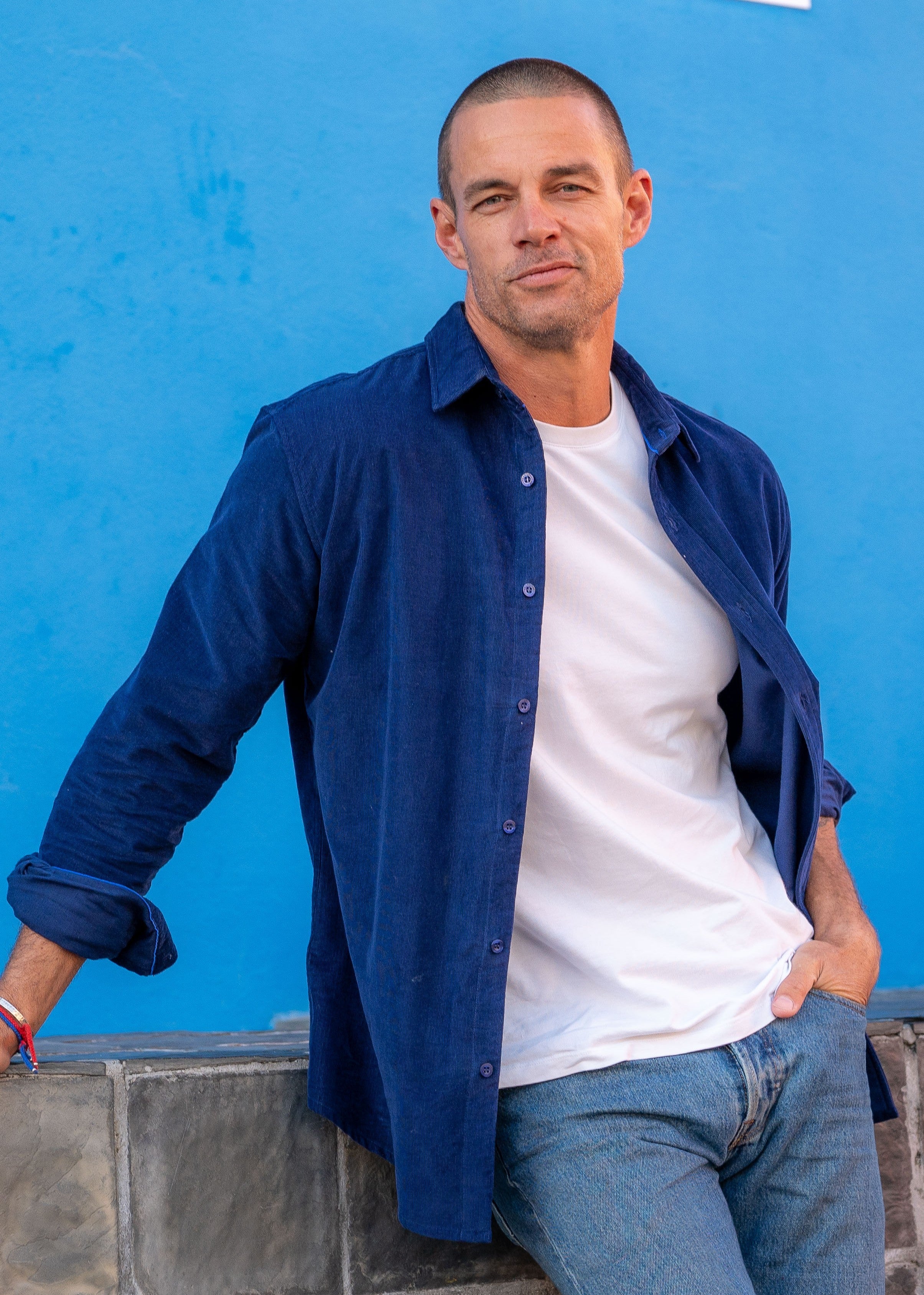 Our navy corduroy Frangipani is cut from soft cotton cord, making it the perfect layer as the seasons turn. The plain navy base gives it timeless versatility for day or night.