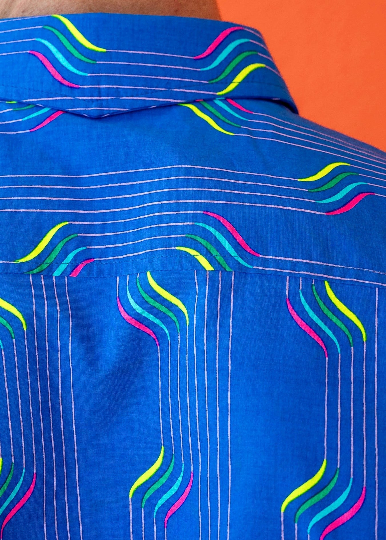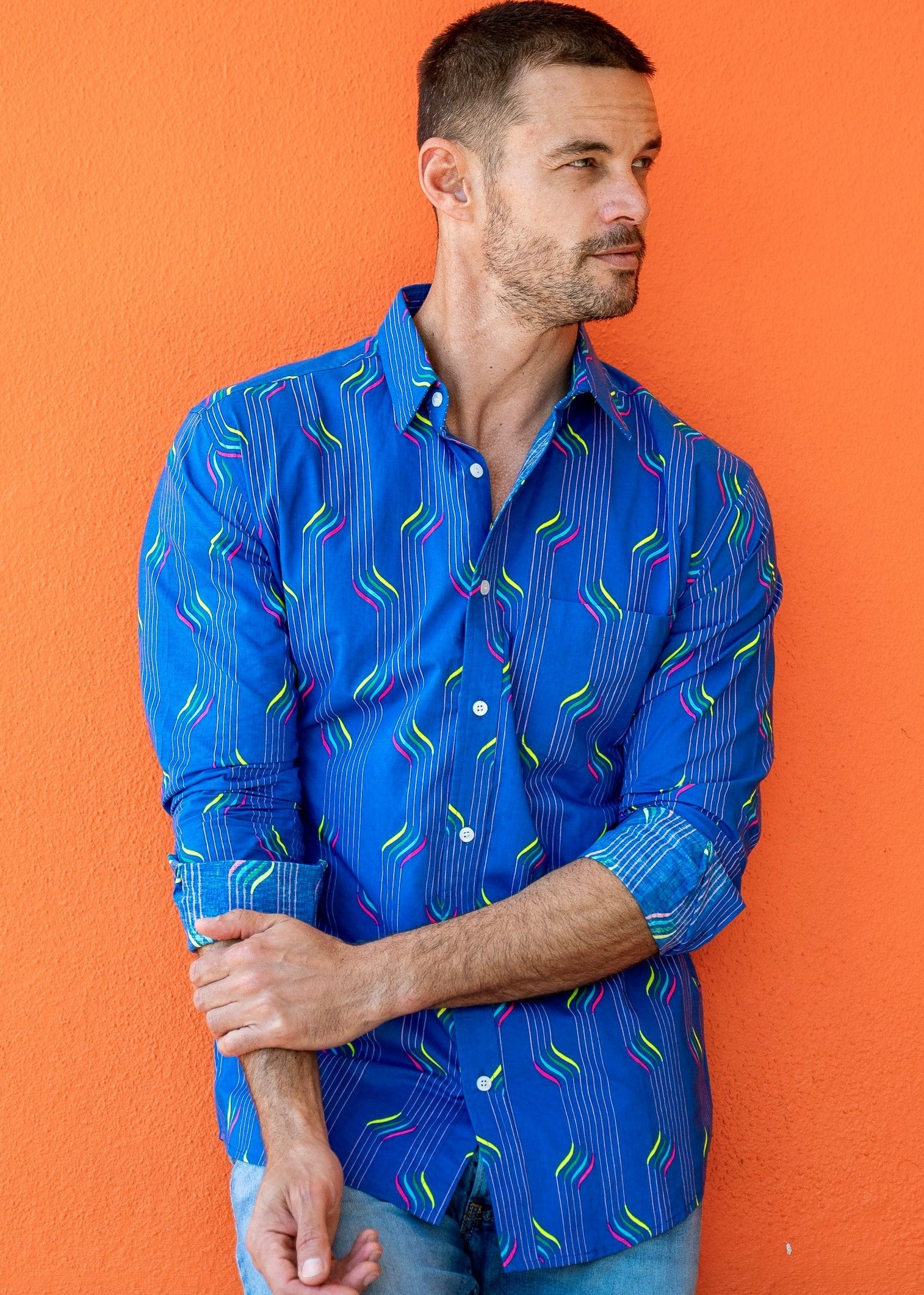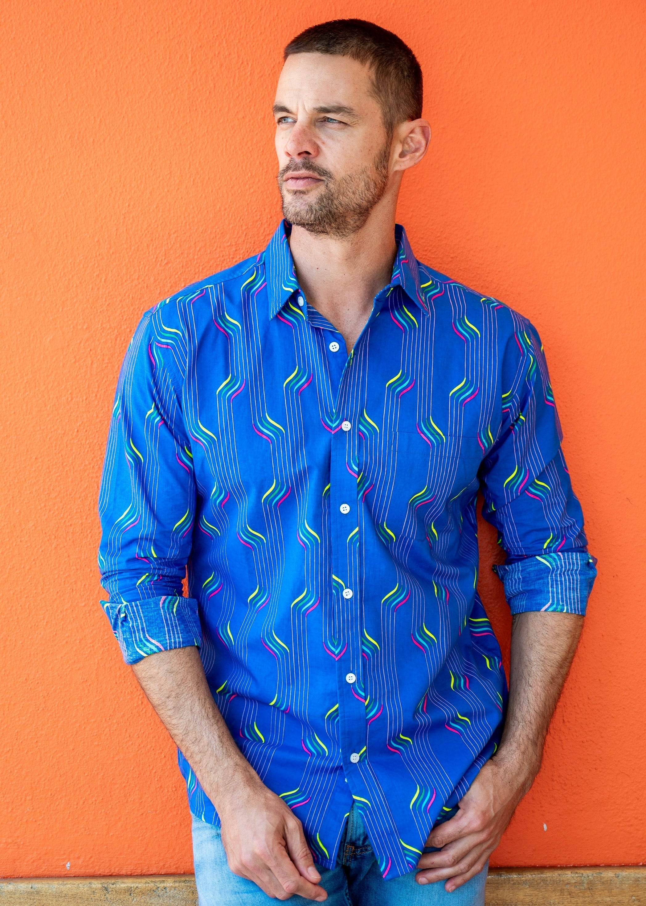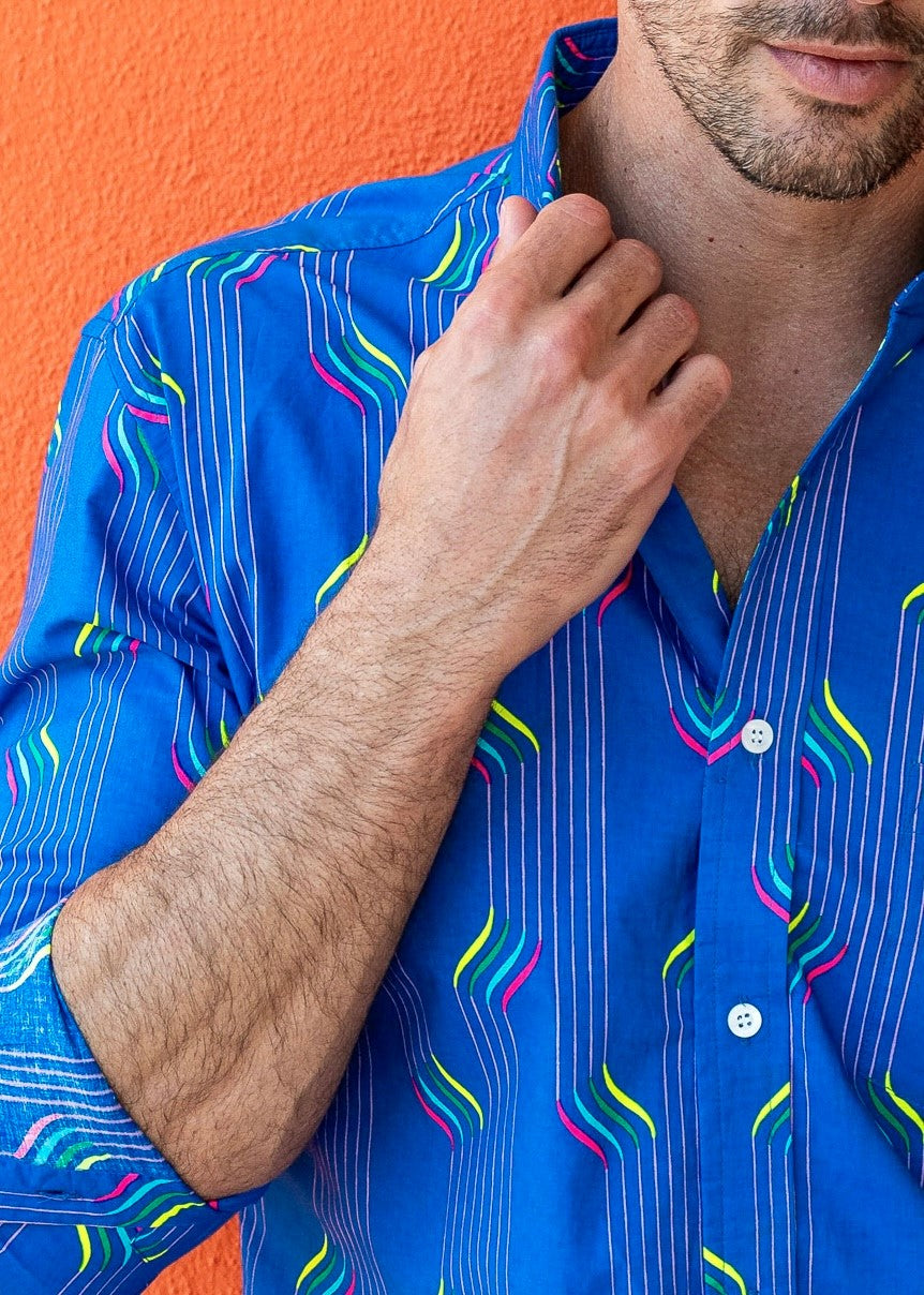 With neon stripes, printed on a rich blue base, this shirt says I am ready to rock.