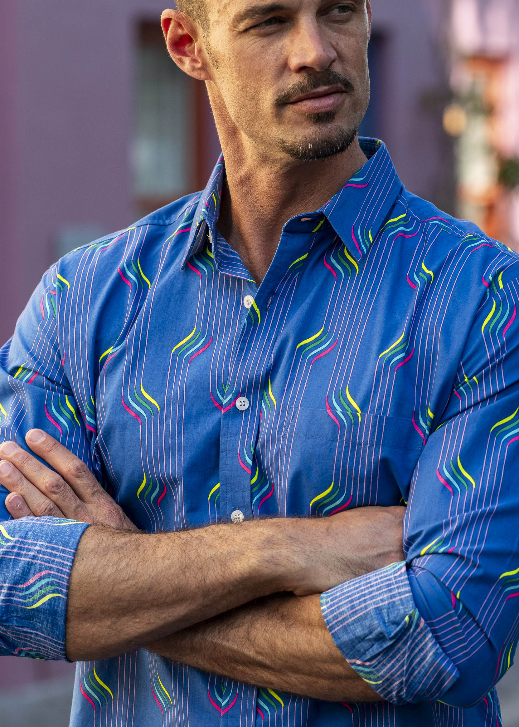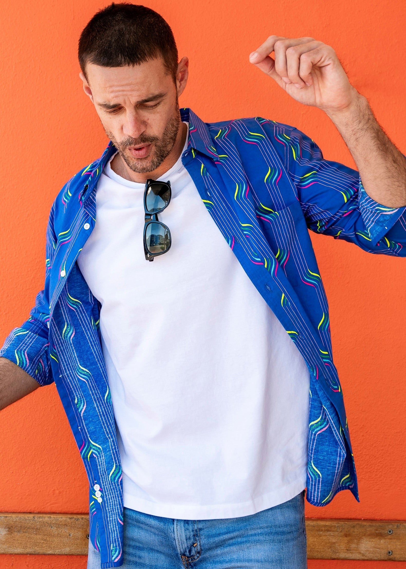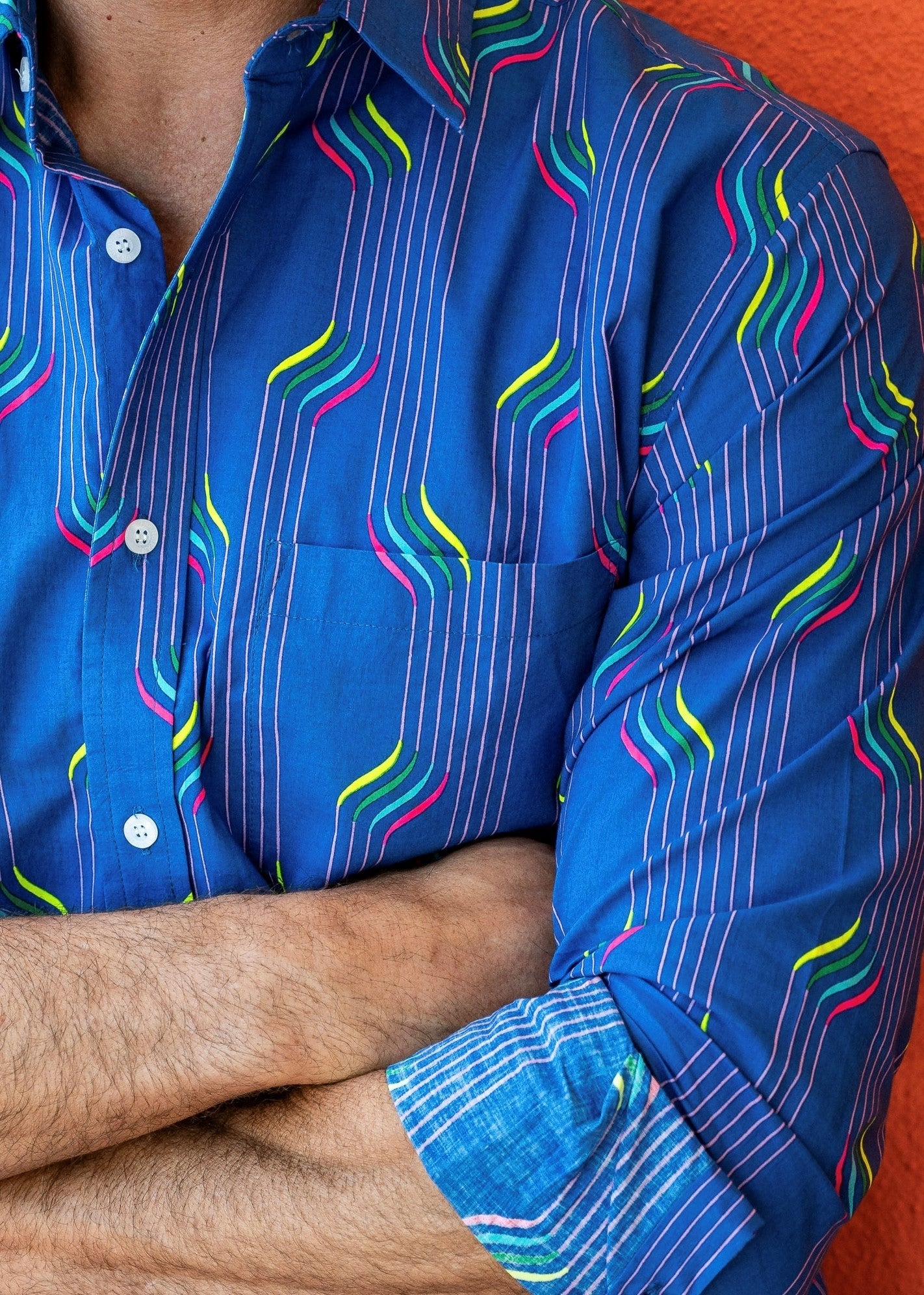 With neon stripes, printed on a rich blue base, this shirt says I am ready to rock.