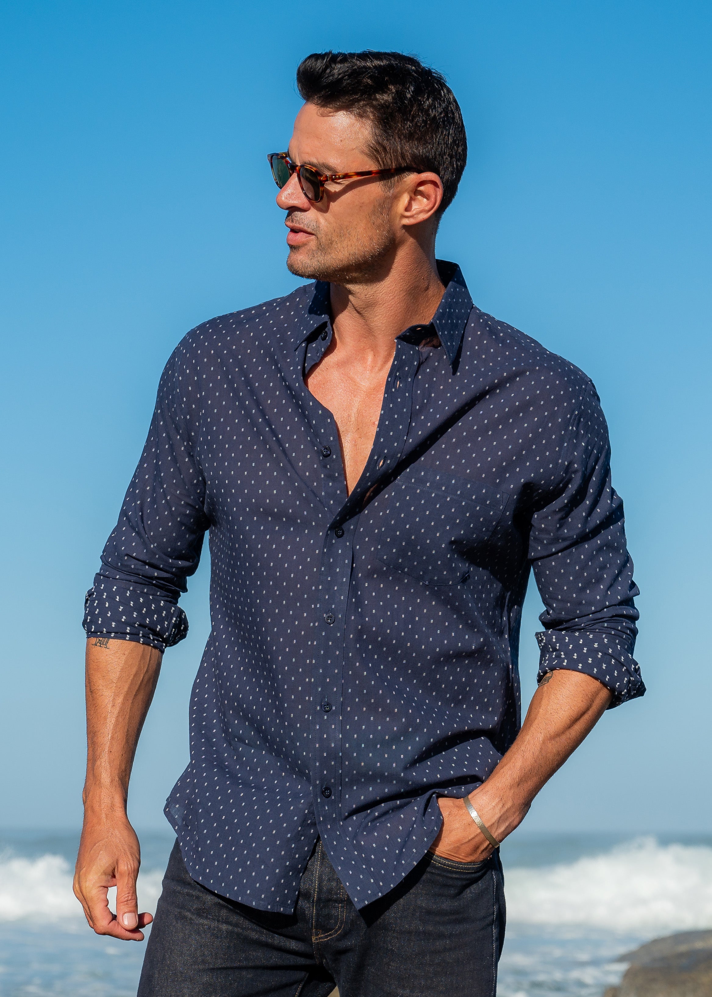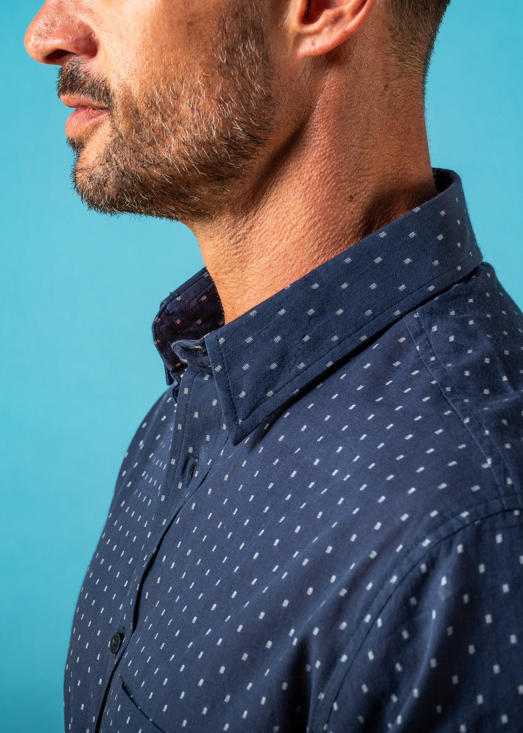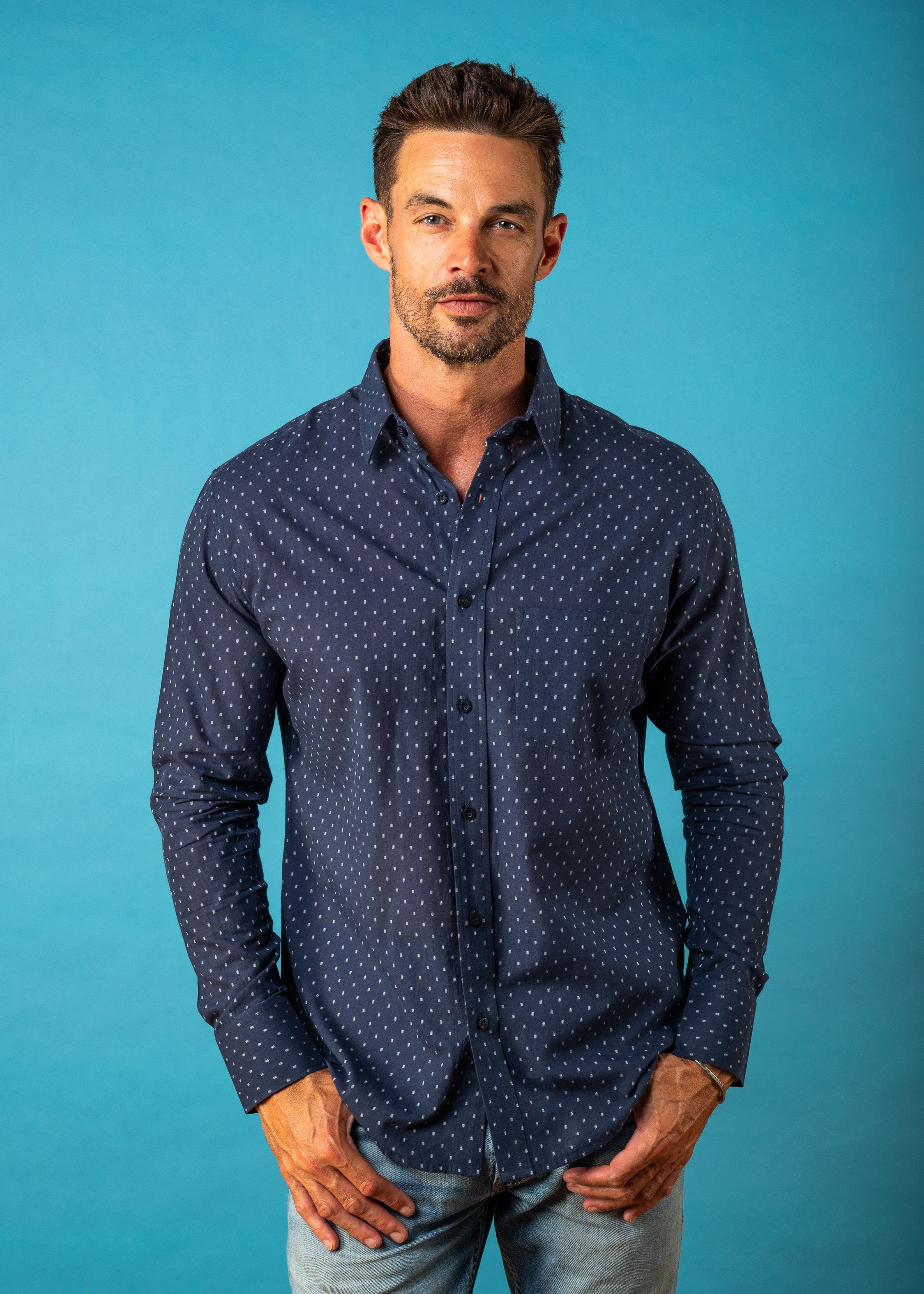 Our Dish Dash Dot shirt in navy features refined, small white dots in 100% cotton.