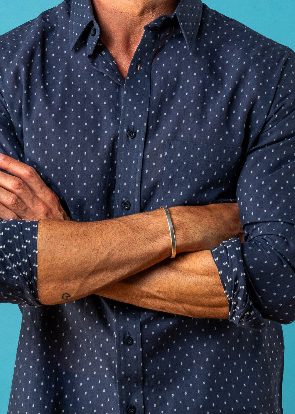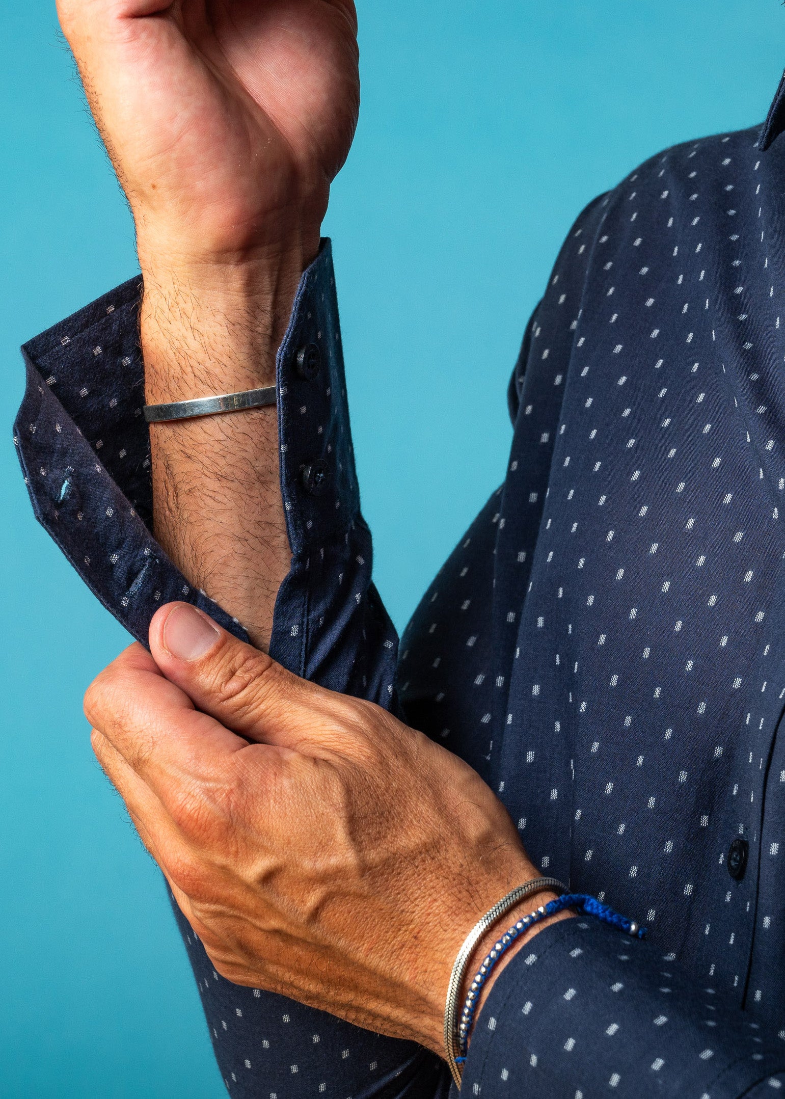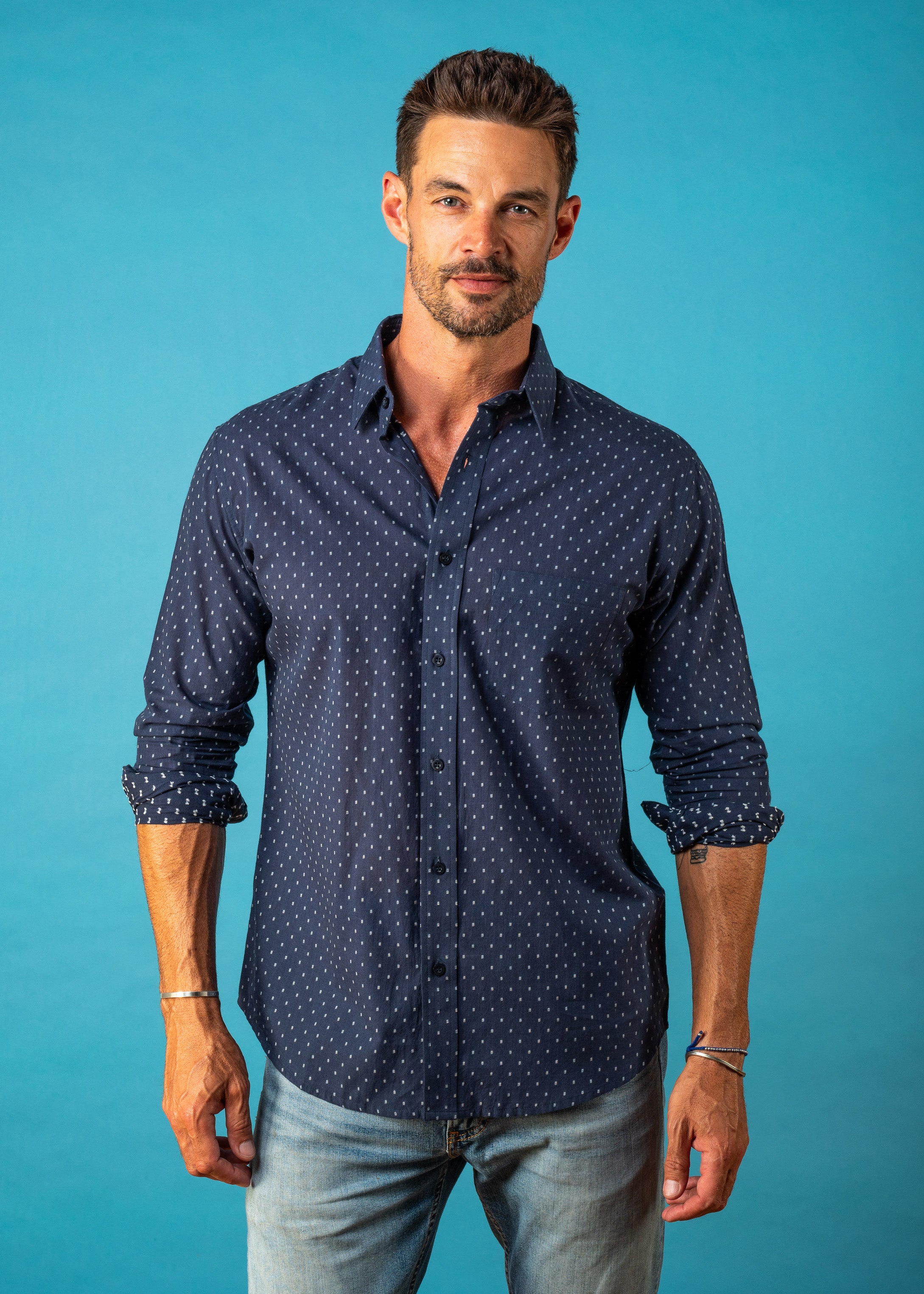 Our Dish Dash Dot shirt in navy features refined, small white dots in 100% cotton.