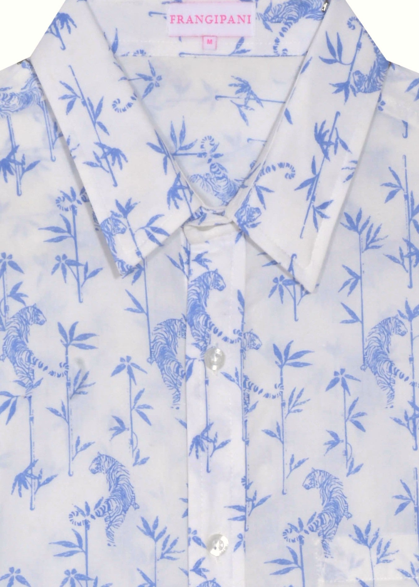 Easy Tiger — calm meets confident. Screen printed for rich, lasting colour, this shirt features playful tigers weaving through bamboo in sky blue on crisp white organic cotton. Easy to wear, with just the right mix of attitude and charm.