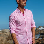 Meet the 'Four Points East' shirt, screen printed on soft organic cotton in vibrant Jaipur pink. This striking piece features a traditional Rajasthani geometric print that adds depth and character to any look. The beautiful symmetry of the design not only captures the eye but also elevates wardrobes with its bold yet refined aesthetic.