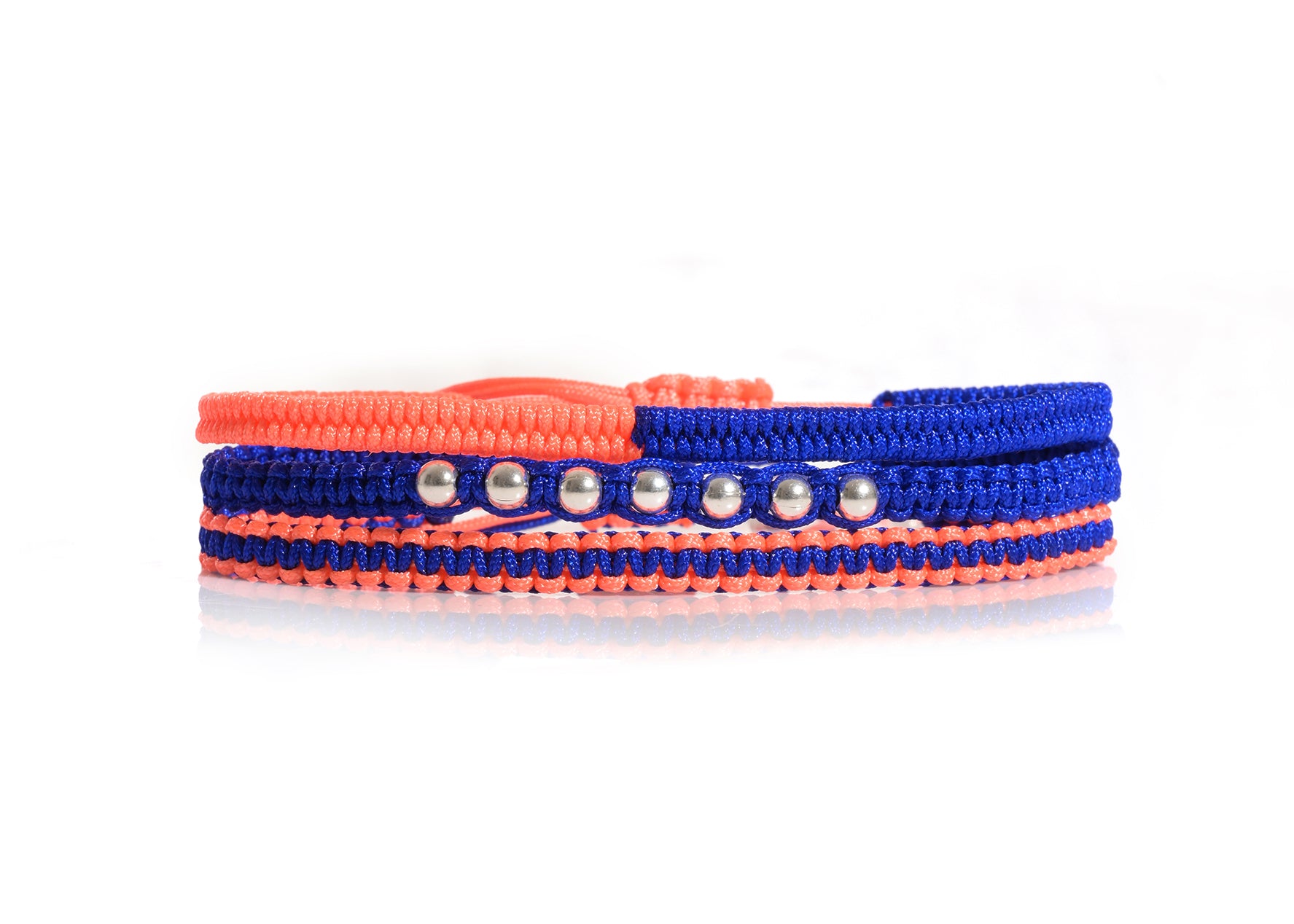 Lucky Seven Triple Stack Macrame and Silver Ball Bracelets in Blue and Neon Orange