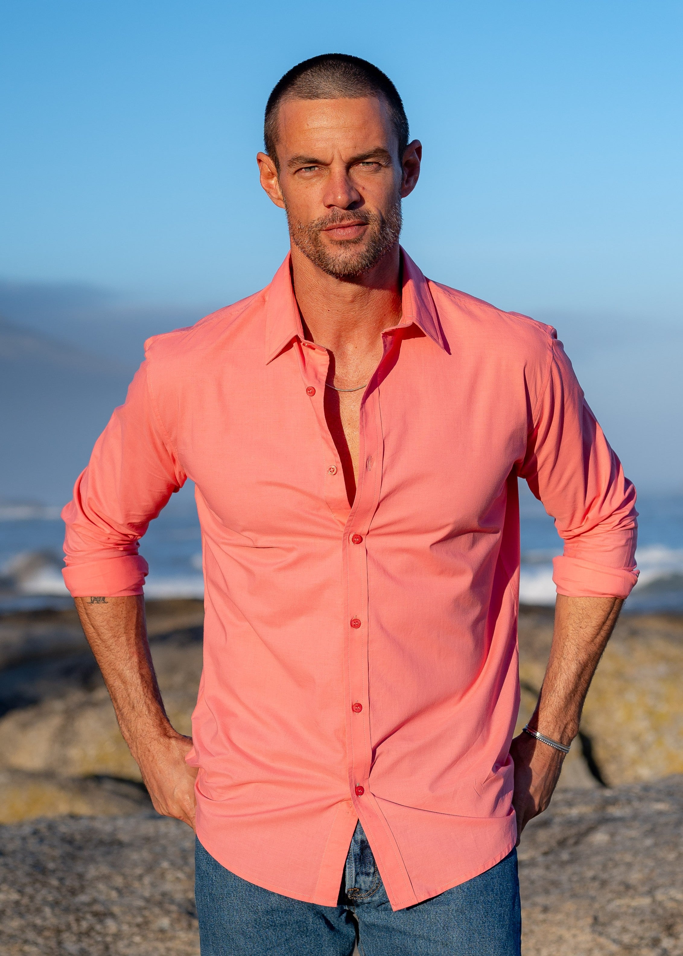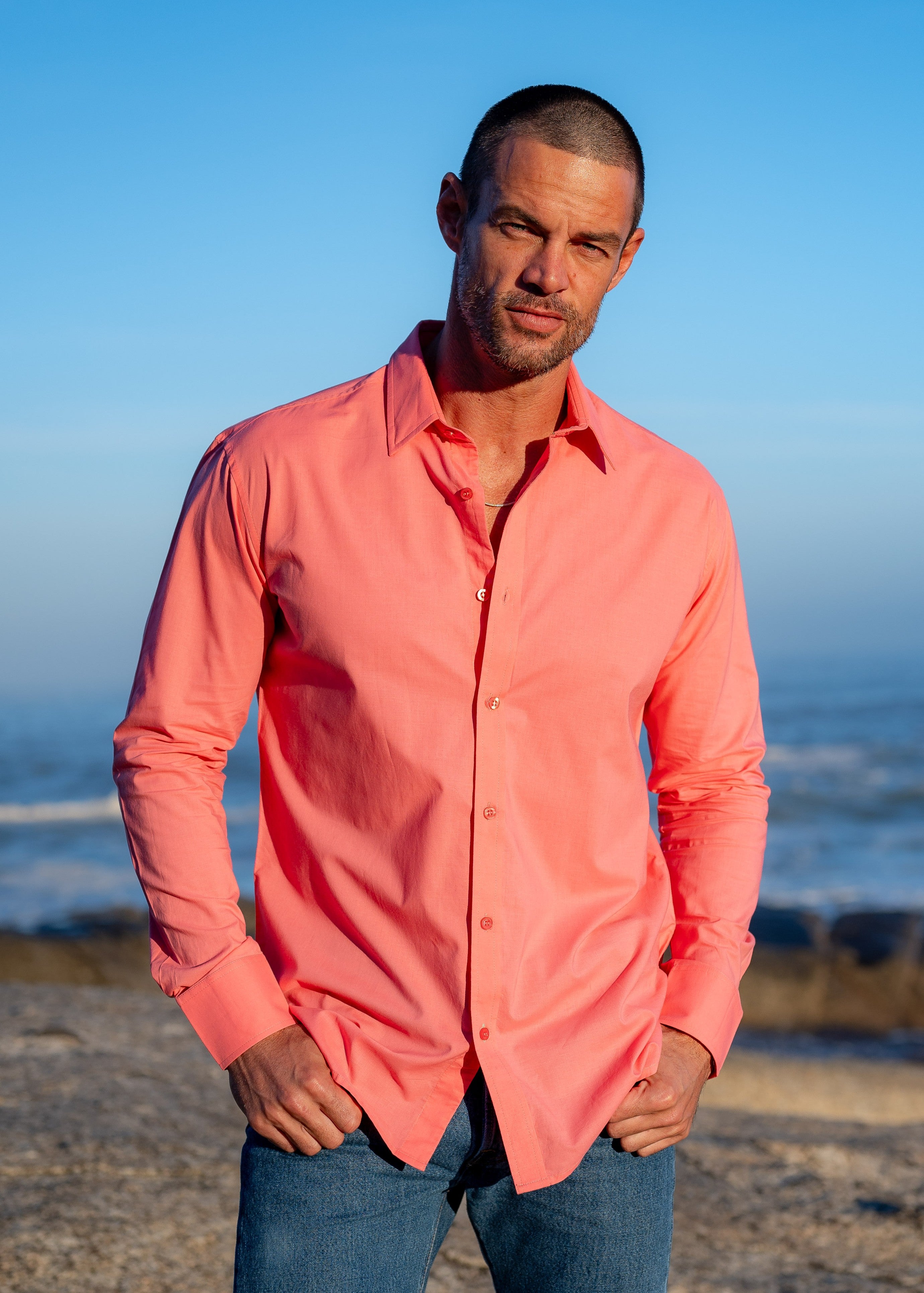 Sometimes less is more. Our plain Sunset Coral shirt is crafted from soft organic cotton in our signature Frangipani cut. Subtle contrast detailing adds a quiet touch of flair, while the bold coral tone brings summer energy without the need for a print.
