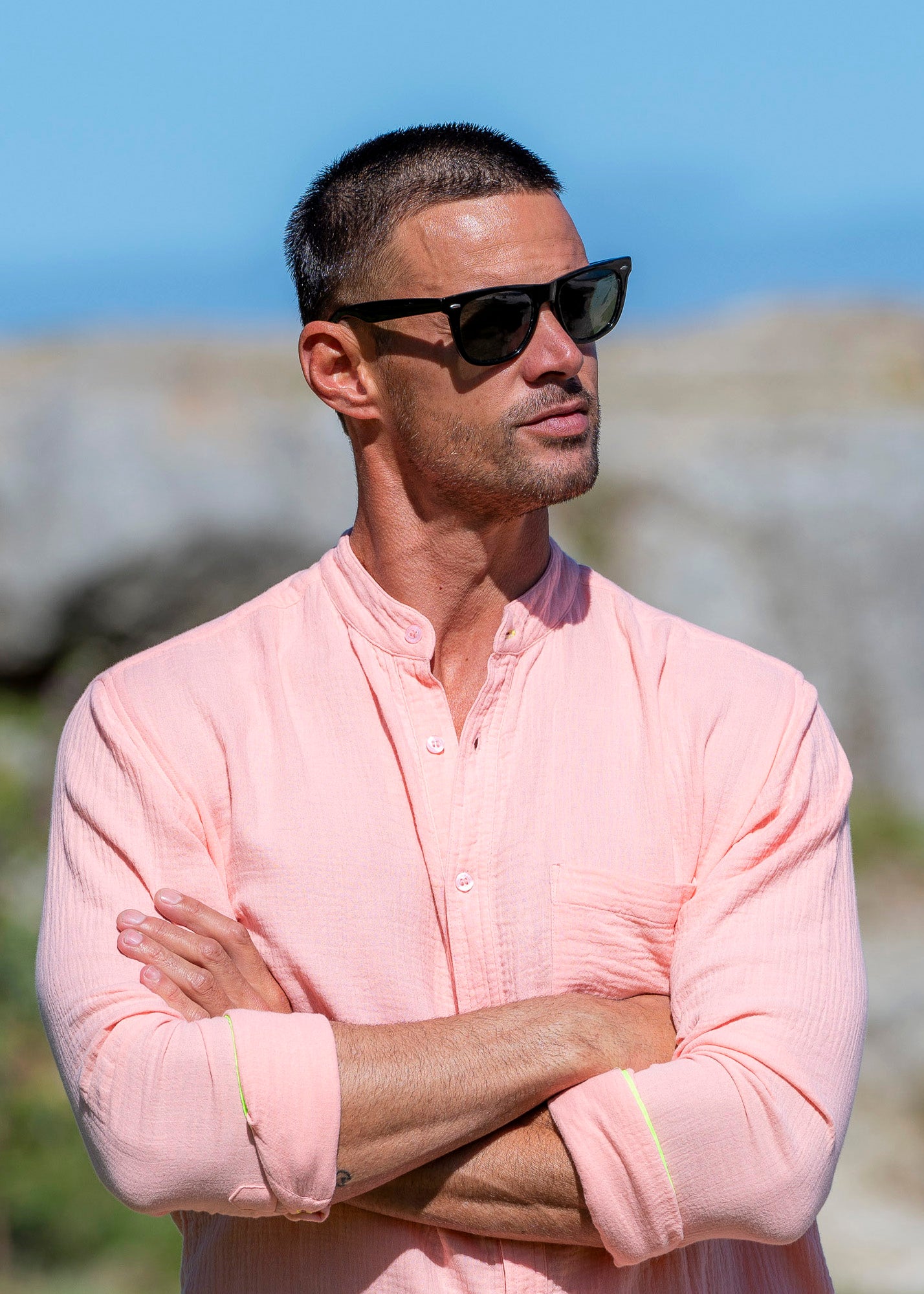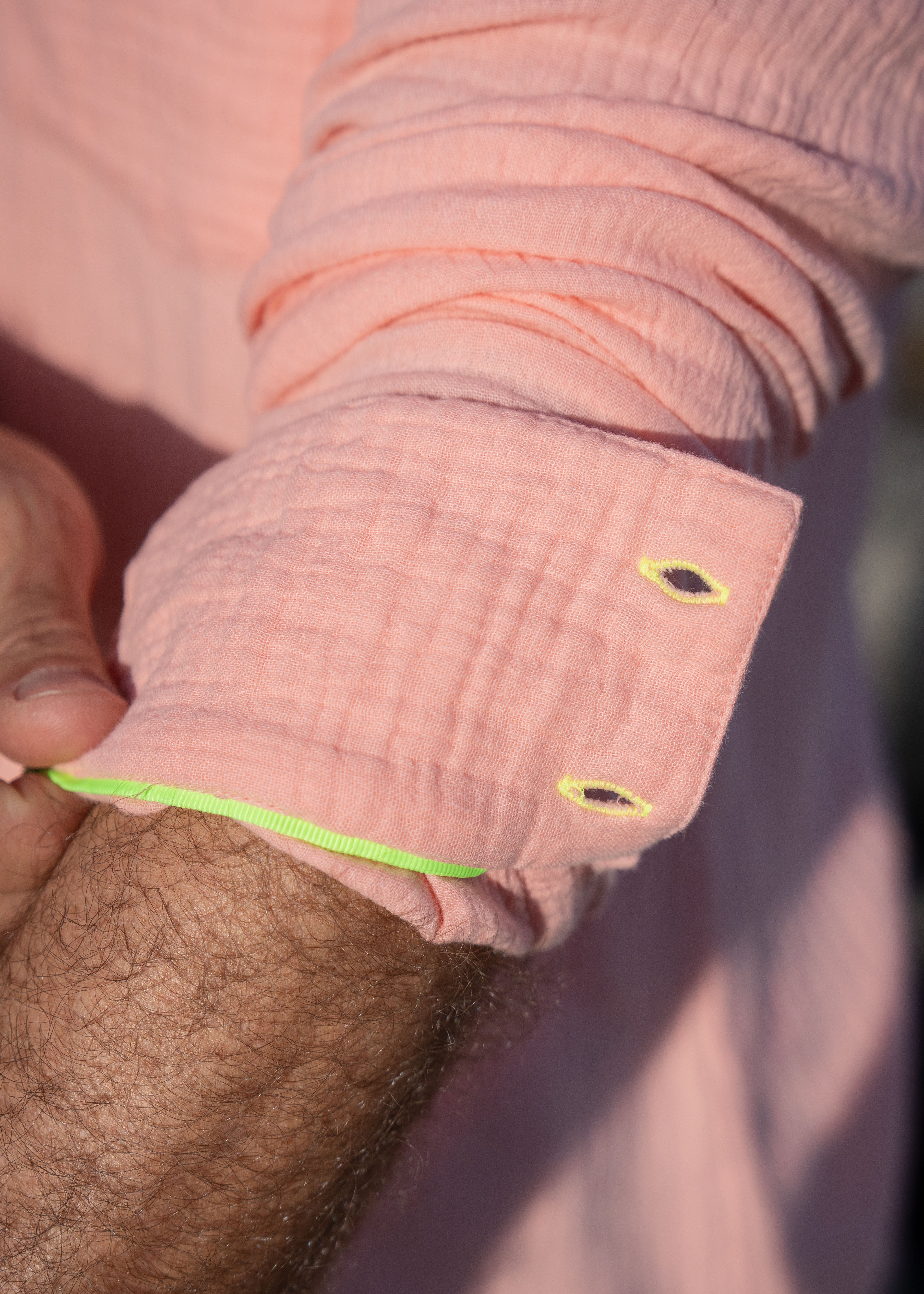With signature contrast colour details on the neck, cuff and buttonholes for a frangipani vibe!