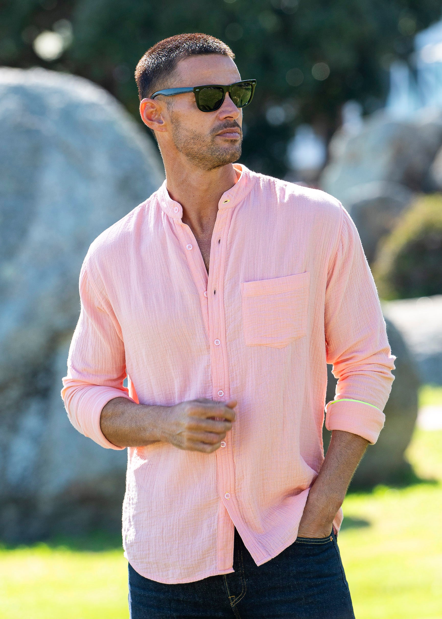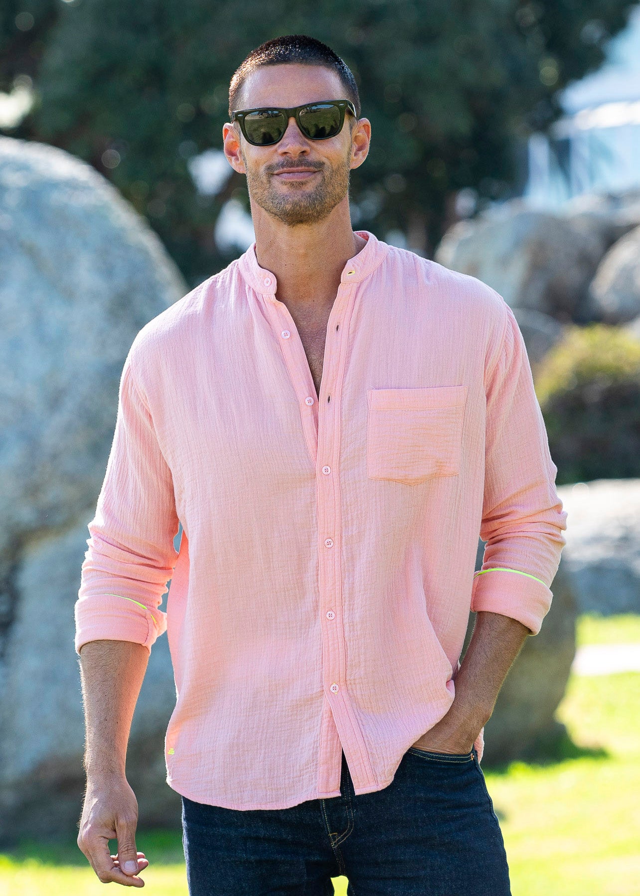 In a washed double-faced cotton gauze for a soft, and gently crinkled feel.