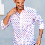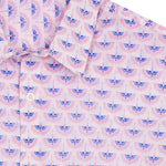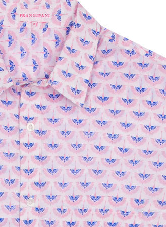 With a vibrant screen print of pink and blue cranes soaring in harmony on a fresh white background, this shirt offers a bold yet refined look perfect for any occasion.
